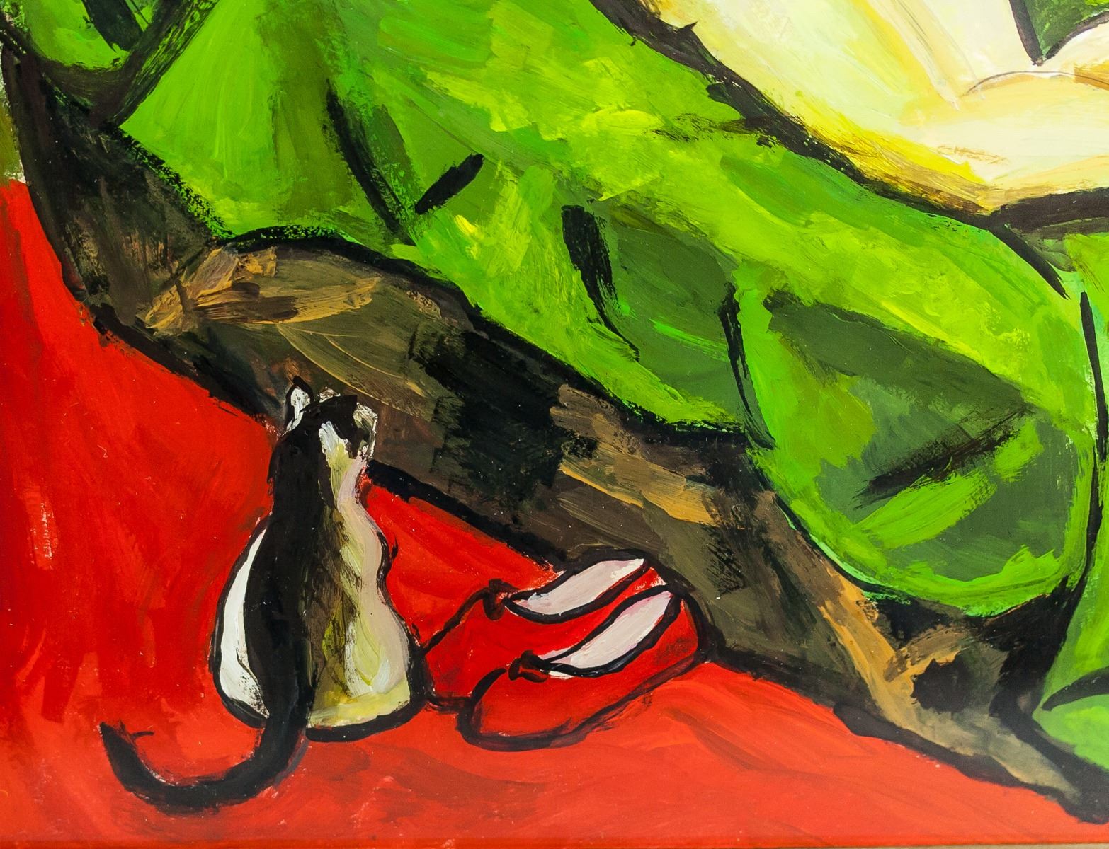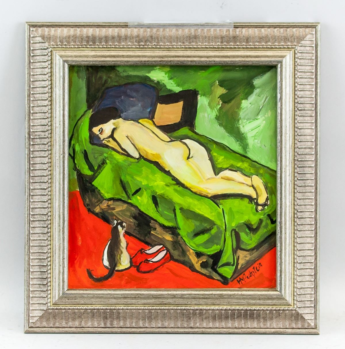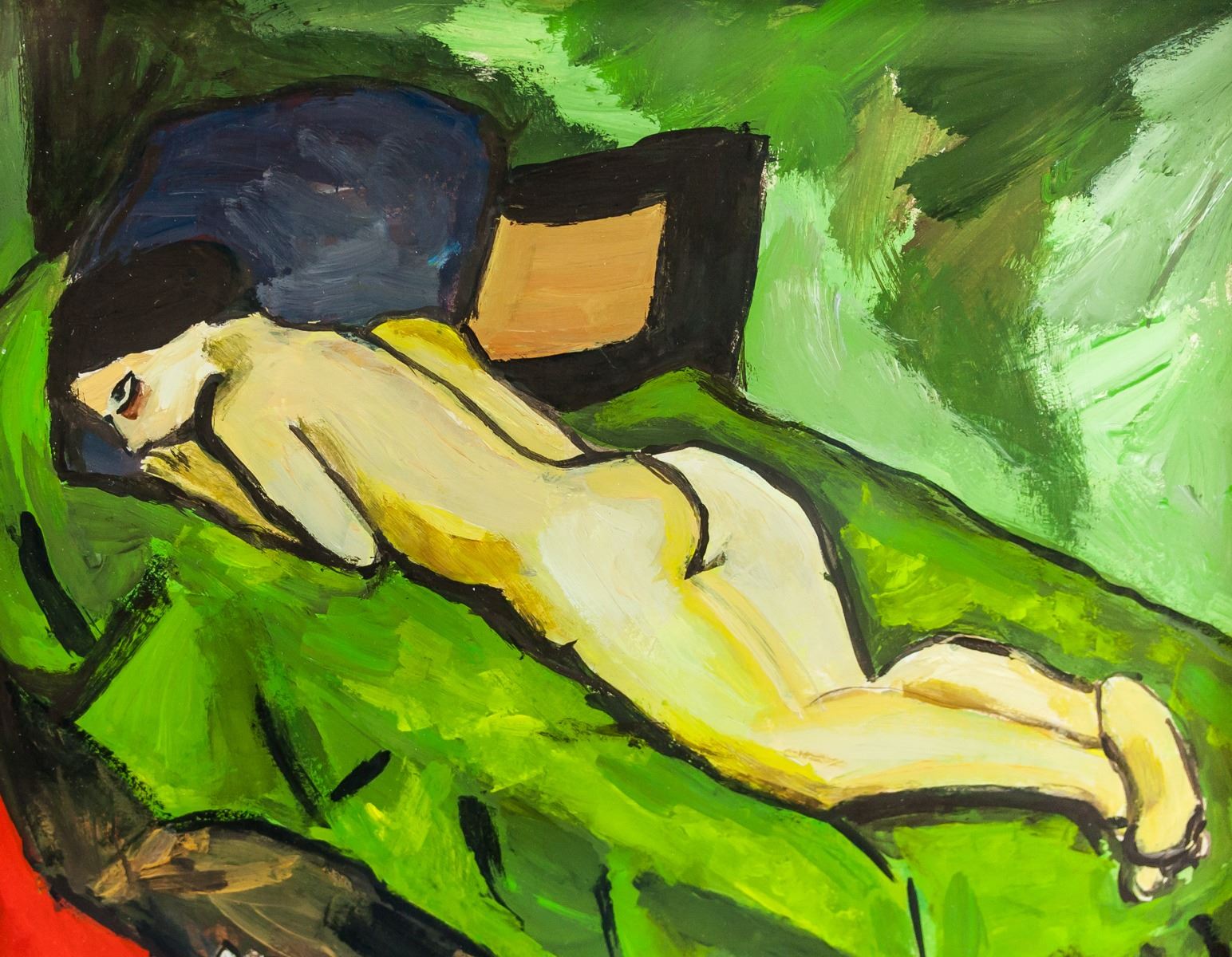 Gouache on paper, framed. Featuring an expressionist scene of a nude lying on bed. Signed Max Pechstein on the lower right corner. Stamped illegibly on verso. Attributed to Max Pechstein (1881-1955, German). 20.5 x 19 cm (8.1 x 7.5 inches). Frame size: 29 x 28 cm (11.4 x 11.0 inches). PROVENANCE: Southern Ontario estate