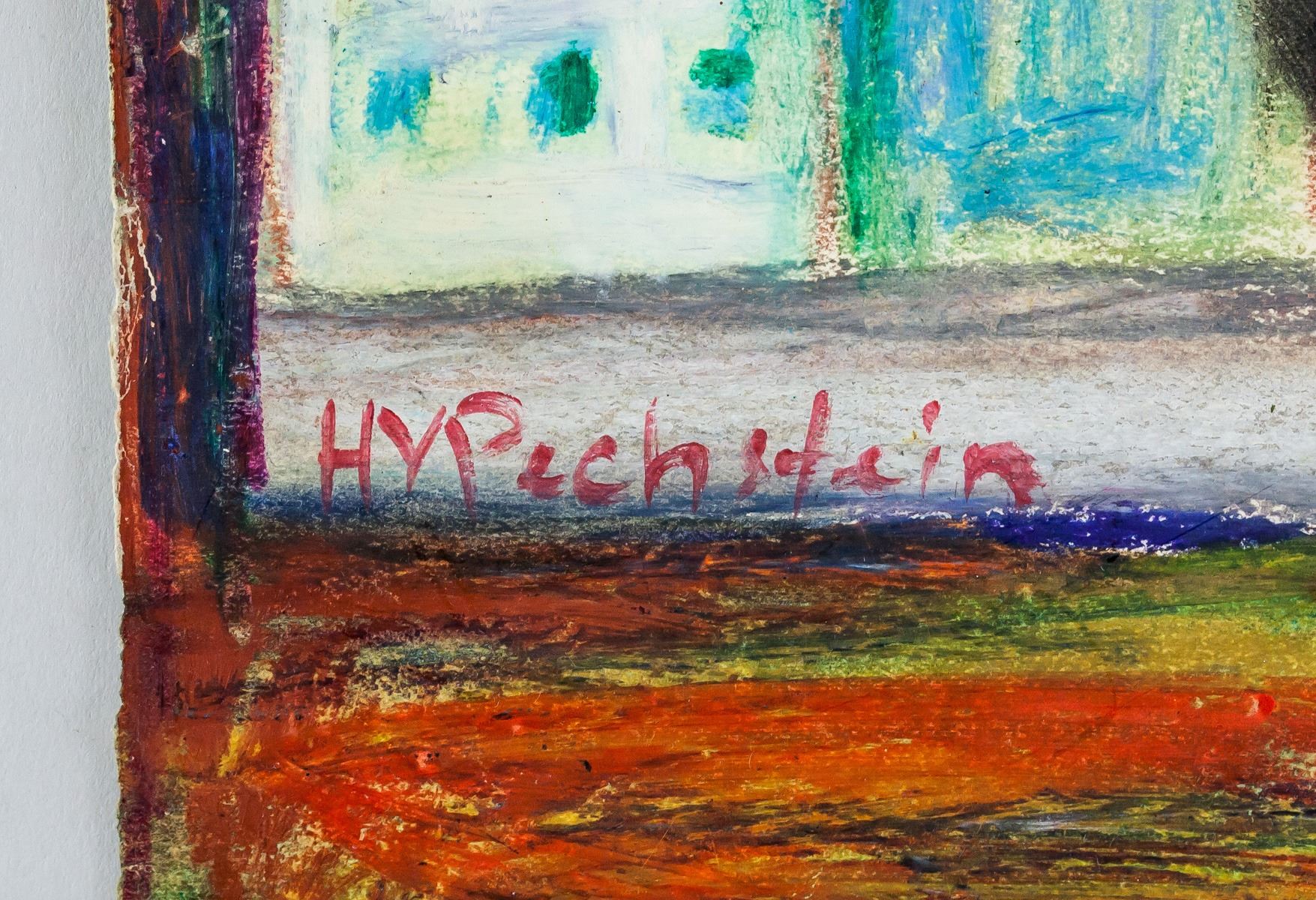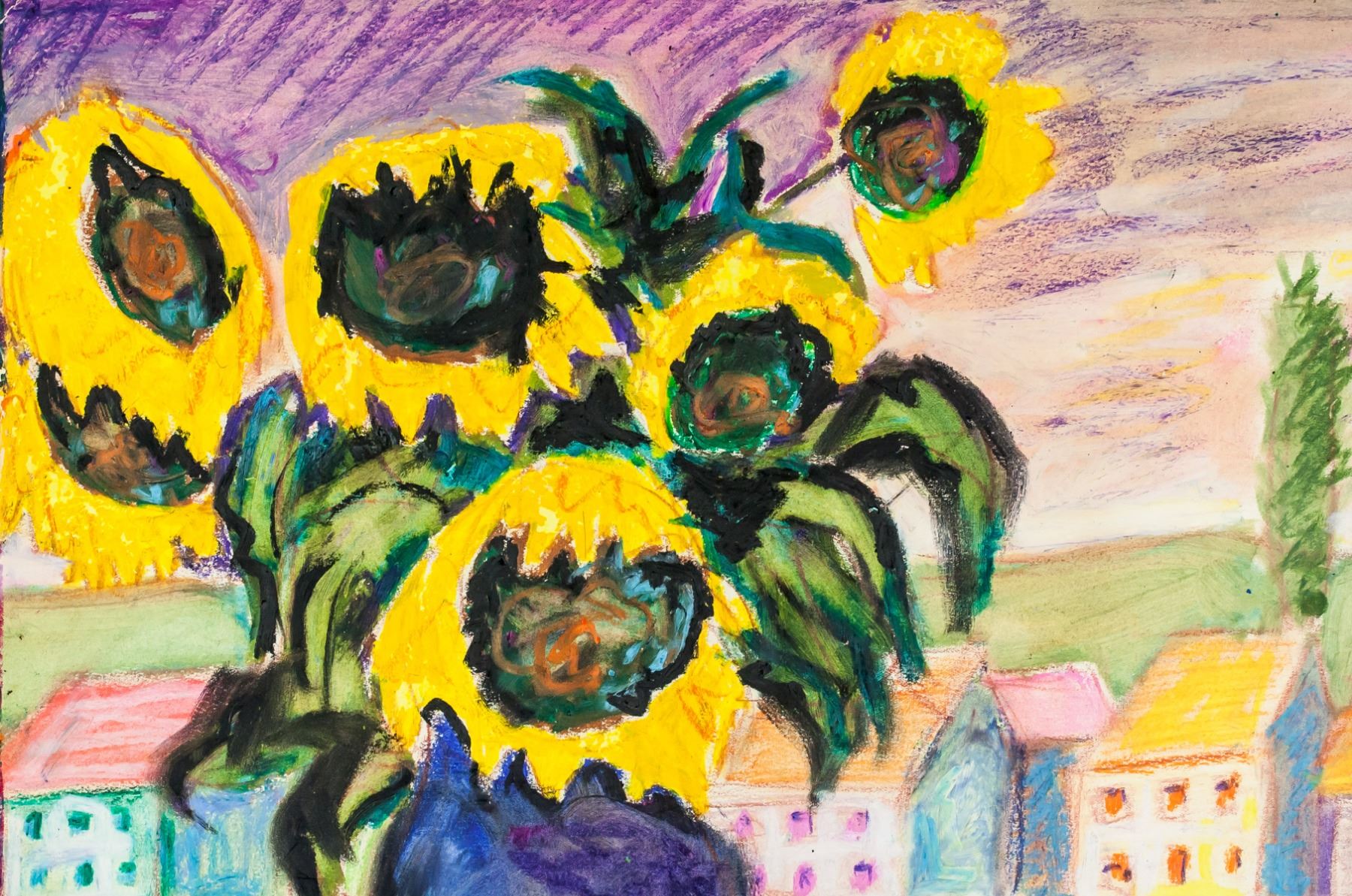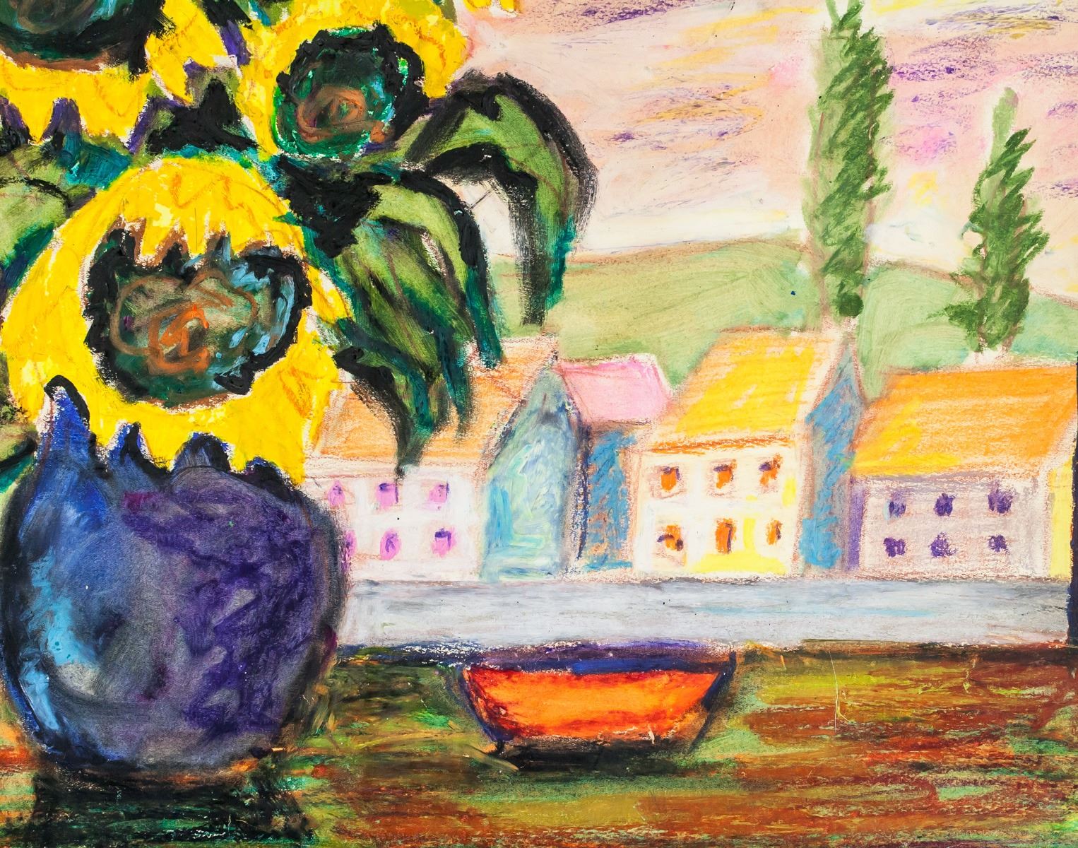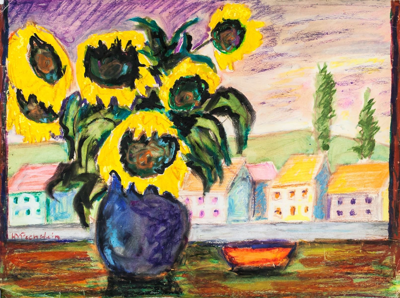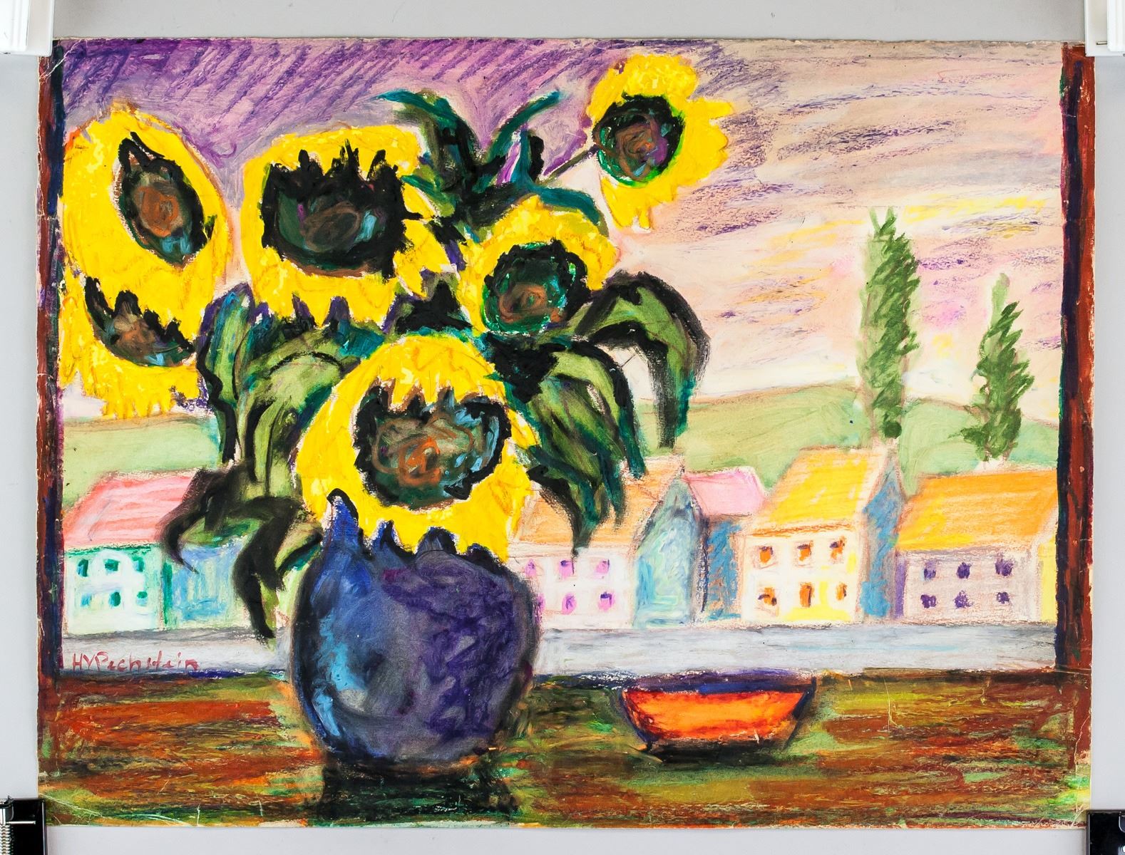Mixed media on paper. Featuring a still life of sunflowers in vase on windowsill with view of a row of houses. Signed HMPechstein on the lower left corner. Attributed to Max Pechstein (1881-1955, German). 50 x 37 cm (19.75 x 14.5 in). PROVENANCE: Upper New York estate