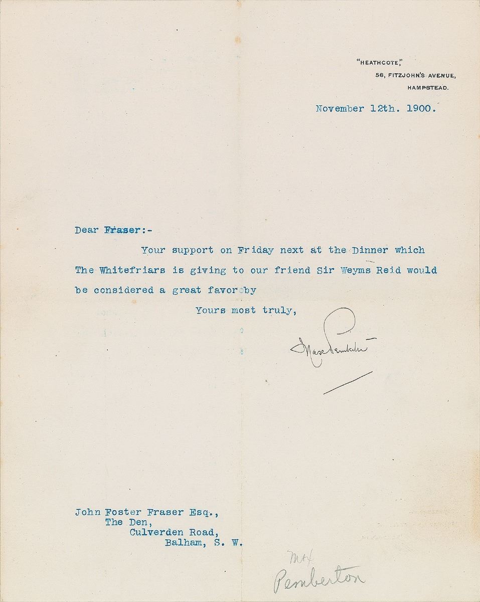 British mystery and adventure novelist (1863–1950). TLS, one page, 8 x 10, Heathcote letterhead, November 12, 1900. Letter to John Foster Fraser. In full: “Your support on Friday next at the Dinner which The Whitefriars is giving to our friend Sir Weyms Reid would be considered a great favor.” In fine condition.