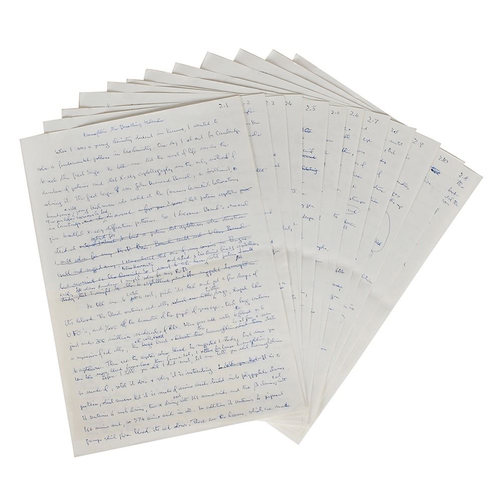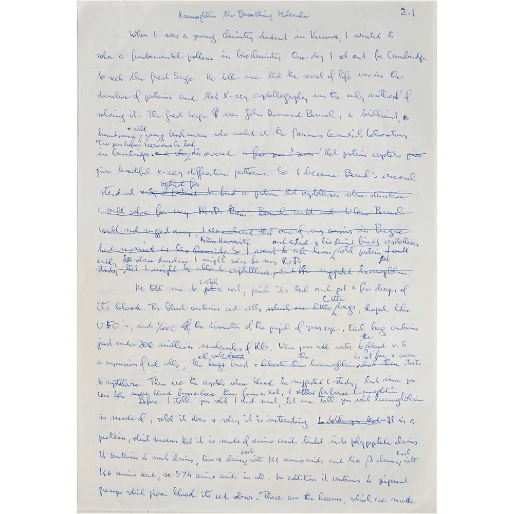 Molecular biologist (1914-2002) who shared the 1962 Nobel Prize for Chemistry with John Kendrew for their studies of the structures of haemoglobin and myoglobin. Unsigned handwritten manuscript by Perutz, 12 pages, 8.25 x 11.75. no date. Draft of a piece entitled "Haemoglobin, the Breathing Molecule." In part: "When I was a young chemistry student in Vienna, I wanted to solve a fundamental problem in biochemistry. One day I set out for Cambridge to meet the Great Sage…John Desmond Bernal…who worked at the Cavendish Laboratory…What does haemoglobin do?…Haemoglobin carries oxygen from the lungs…It took me 16 years from 1937-1953 to discover a method of interpreting the X-ray diffraction patterns of haemoglobin…I was wildly excited when it finally emerged." Includes a 1981 ALS in German, signed "M. F. Perutz." In fine condition.