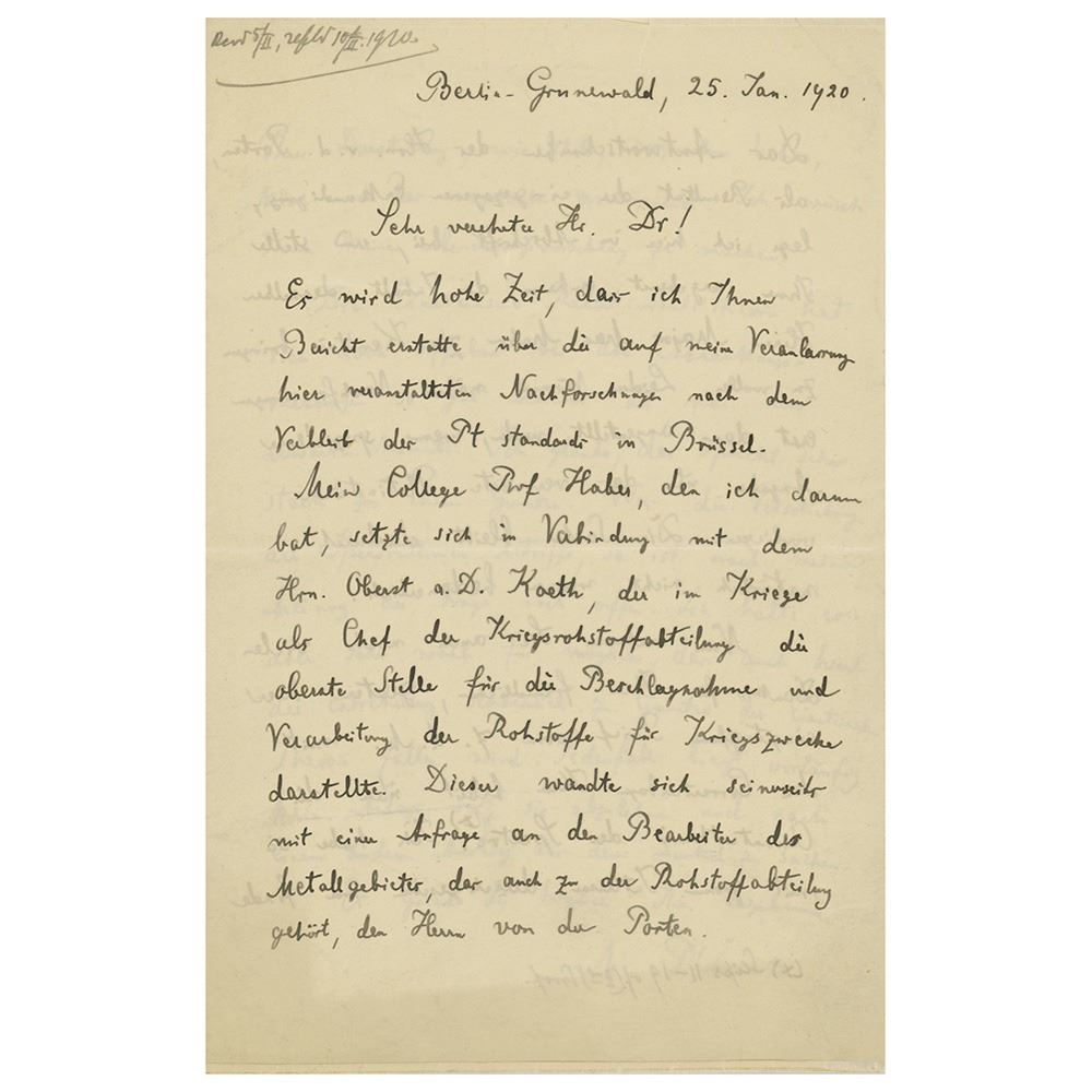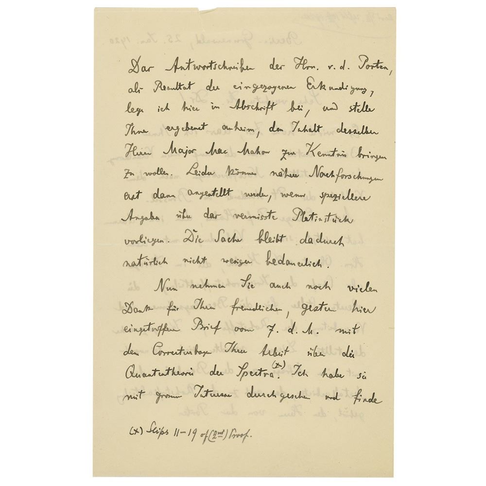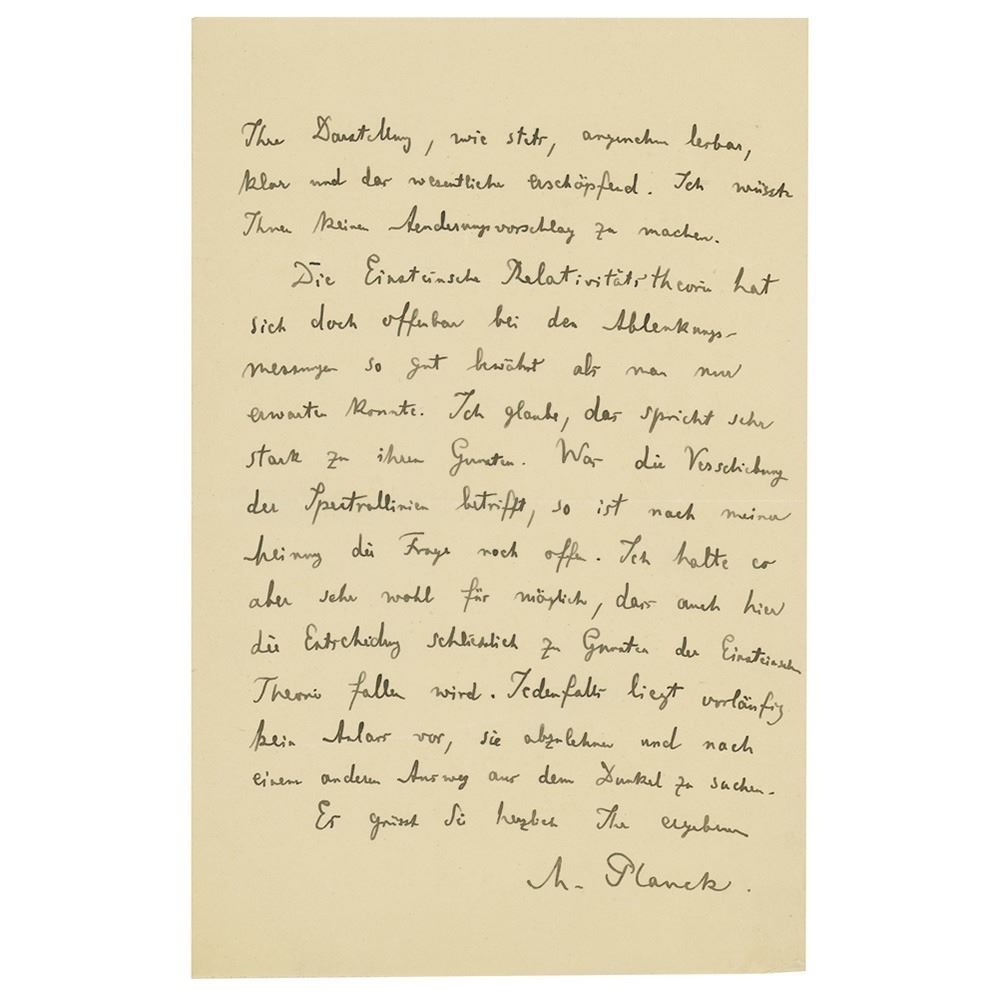 ALS in German, signed “M. Planck,” three pages on two adjoining sheets, 5.5 x 8.5, January 25, 1920. Handwritten letter to Dr. Ludwik Silberstein, following up on the missing platinum standard and once again defending Einstein's theory. In full (translated): "It is high time that I report to you about the inquiries conducted here on my initiative in search of the location of the Pt standard in Brussels.