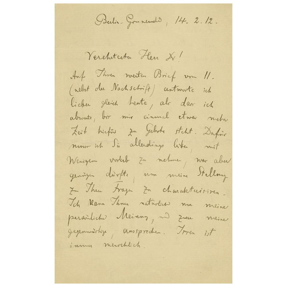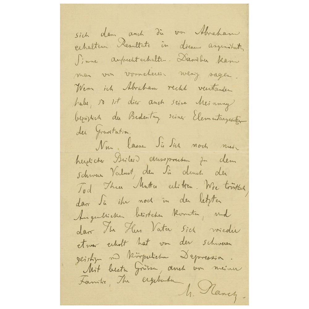 ALS in German, signed “M. Planck,” four pages on two adjoining sheets, 4.5 x 7, February 14, 1912. Handwritten letter to Dr. Ludwik Silberstein, discussing his former Ph.D. student Max Abraham’s 1912 theory of gravitation—a precursor to Einstein’s general theory of relativity, the theory of gravity as spacetime geometry. In part (translated): "I would rather answer your valued letter (along with the postscript) of the 11th right away today than wait until at some point I have somewhat more time at my disposal to do so. However, I have to ask you in exchange to make do with a little, which should nonetheless be enough to characterize my position in relation to your question. Naturally, I can only give you my personal opinion, and indeed my current one. To err is always human.