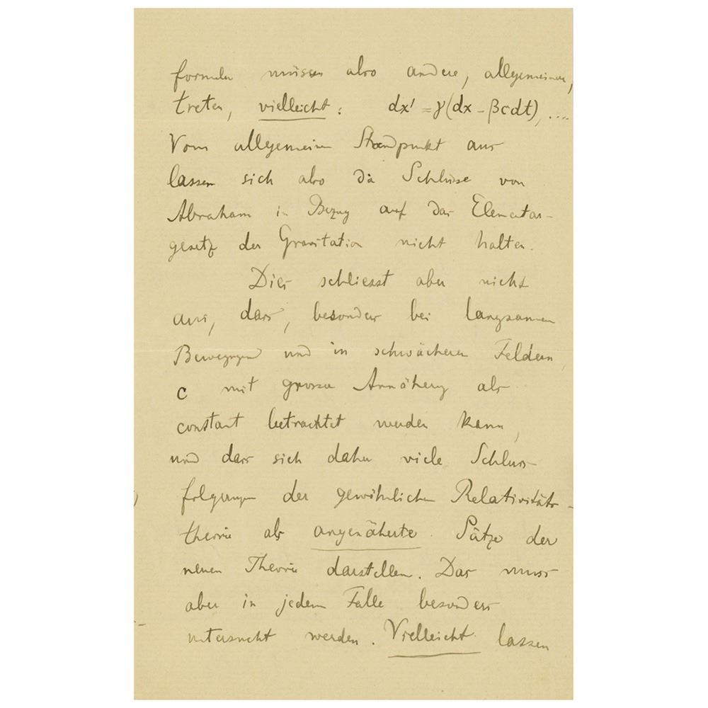 However, this does not exclude the possibility that, especially in the case of slow movements and in weak fields, c can be considered as constant to a high degree of approximation, and consequently that many conclusions of the usual theory of relativity appear as approximate theorems of the new theory. This must nevertheless be specially investigated in every case. Perhaps the results obtained by Abraham can then also be upheld in this approximated sense. Little can be said about this in advance. If I have understood Abraham correctly, this is also his opinion with regard to the significance of his elementary law of gravitation.