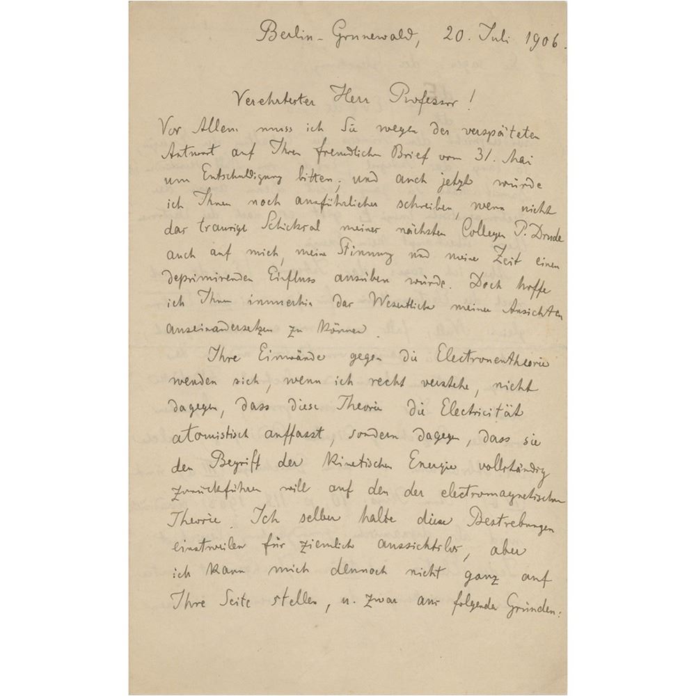 In part (translated): "Before anything else, I have to ask your forgiveness for the delayed answer to your friendly letter of 31 May, and even now I would still write to you at greater length if the sad fate of my close colleague P. Drude did not also have a depressing influence on me, my mood, and my time. Nevertheless, I hope even so to be able to lay out for you the essence of my views. Your objections to the electron theory, if I understand correctly, are not directed at the fact that this theory takes an atomistic approach to electricity, but rather at the fact that it seeks to trace the concept of kinetic energy completely back to the electromagnetic theory’s concept. I myself consider these efforts quite hopeless for the time being, but I nevertheless cannot entirely take your side...You say that the equation...contradicts the principle of conservation of energy as long as the integral ∫εvp dt is different from zero. In this, you are entirely correct. Except for the Electromagnetic energy E, there is no energy at all according to the electron theory. But I say that the integral ∫εvp dt is equal to zero for every individual electron according to the electron theory, in the case that, as is necessary, one understands under ε the entire electrical field strength originating from the electron and from the other electrons. At base, leaving aside the designation of the same condition, this is what M. Abraham expresses in his equations (IIIa) and (IIIb) (Ann. Phys. 10, p. 118, 1903) and calls a 'dynamic fundamental equation.' Each electron is always in equilibrium under the influence of the resulting internal and external forces. This gives rise to exactly as many equations for each electron as the electron has degrees of freedom of movement." In fine condition.