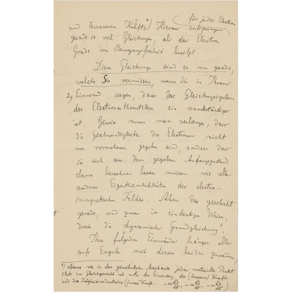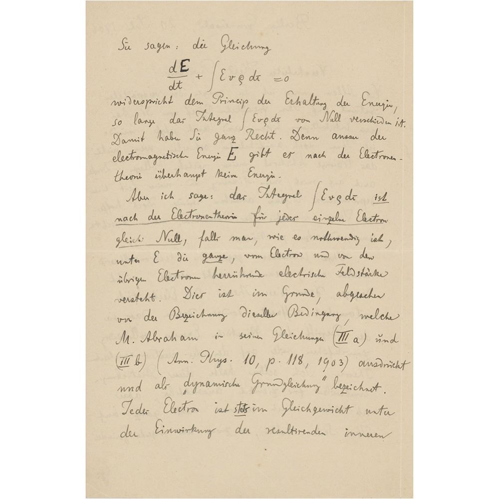 In part (translated): "Your objections to the electron theory, if I understand correctly, are not directed at the fact that this theory takes an atomistic approach to electricity, but rather at the fact that it seeks to trace the concept of kinetic energy completely back to the electromagnetic theory’s concept. I myself consider these efforts quite hopeless for the time being, but I nevertheless cannot entirely take your side...You say that the equation...contradicts the principle of conservation of energy as long as the integral ∫εvp dt is different from zero. In this, you are entirely correct. Except for the Electromagnetic energy E, there is no energy at all according to the electron theory. But I say that the integral ∫εvp dt is equal to zero for every individual electron according to the electron theory, in the case that, as is necessary, one understands under ε the entire electrical field strength originating from the electron and from the other electrons. At base, leaving aside the designation of the same condition, this is what M. Abraham expresses in his equations (IIIa) and (IIIb) (Ann. Phys. 10, p. 118, 1903) and calls a 'dynamic fundamental equation.' Each electron is always in equilibrium under the influence of the resulting internal and external forces. This gives rise to exactly as many equations for each electron as the electron has degrees of freedom of movement." In fine condition.