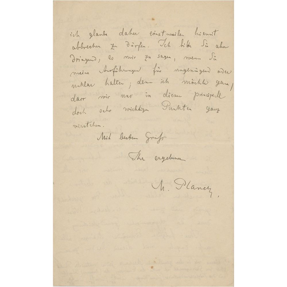 Planck opens this letter apologizing for his delay in replying, which he attributes to the “sad fate” of his friend and fellow physicist Paul Drude. Drude, the editor of Annalen der Physik—a post that Planck would later hold—had for no apparent reason committed suicide two weeks before. An interesting letter, as it deals with Silberstein’s objections to, and Planck’s thoughts on, “electron theory.”Important ALS in German, signed “M. Planck,” four pages on two adjoining sheets, 5.5 x 8.5, July 20, 1906. Handwritten letter to Dr. Ludwik Silberstein on electron theory, controversial at the time as a microscopic theory of electricity. Silberstein does not believe in electron theory and produces an equation that seems to show that the fundamental physical principle of conservation of energy is violated. Planck points out that another physicist, Max Abraham, has published a paper in which he showed that the offending term in that equation is always equal to zero.