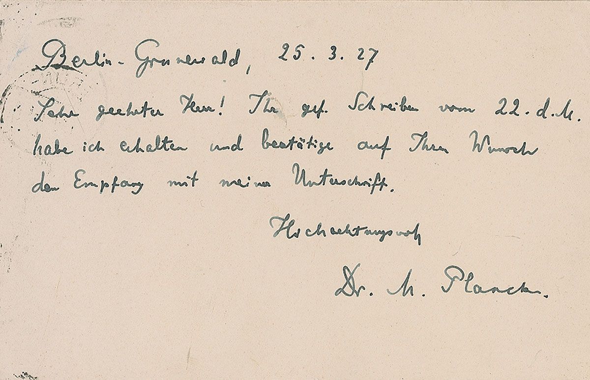 ALS in German, signed “Dr. M. Planck,” one page on a 5.5 x 3.5 postcard, Berlin-Grunewald, March 25, 1927. Untranslated letter to Georg Feish of Prague. In fine condition, with a light postmark stamp and some stray ink marks slightly affecting writing to upper left.