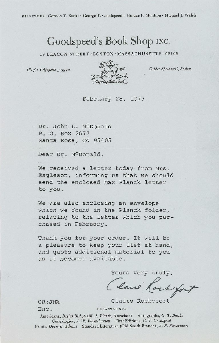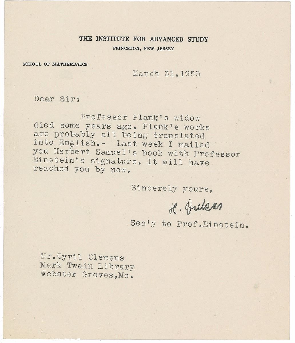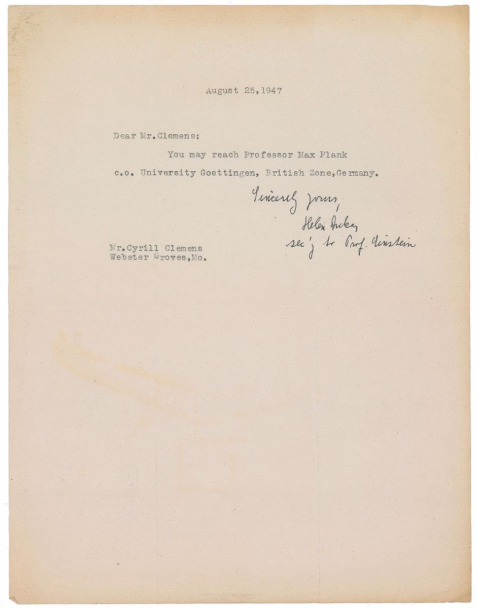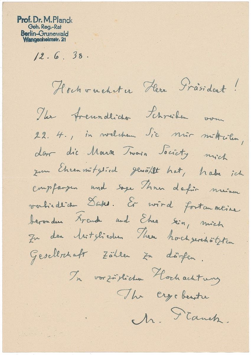 ALS in German, signed “M. Planck,” one page, 5.75 x 8.25, stamped personal letterhead, June 12, 1938. Letter thanking Samuel Clemens' distant cousin Cyril Clemens for electing him an honorary member of the Mark Twain Society. In part (translated): "I have received your kind letter of 22.4 in which you notified me that the Mark Twain Society has elected me as an honorary member and I want to thank you very much for that. It will be my special pleasure and honor from now on to be permitted to count myself amongst the members of your greatly esteemed Society.” Also includes a letter from Einstein’s secretary forwarding Planck’s address. In fine condition. Accompanied by the original mailing envelope addressed in his own hand. Originally purchased from Goodspeed’s Book Shop and accompanied by their transmittal letter.