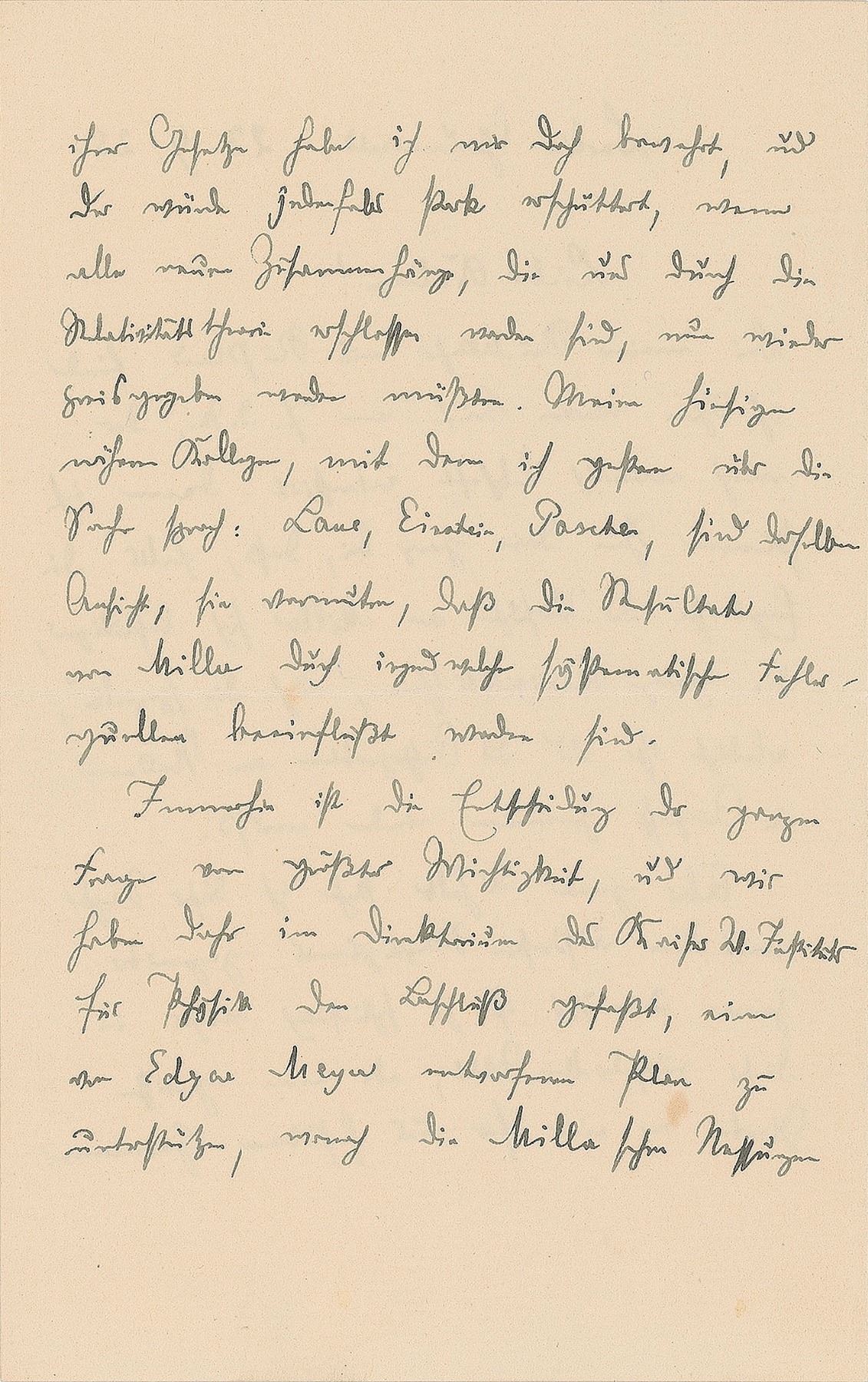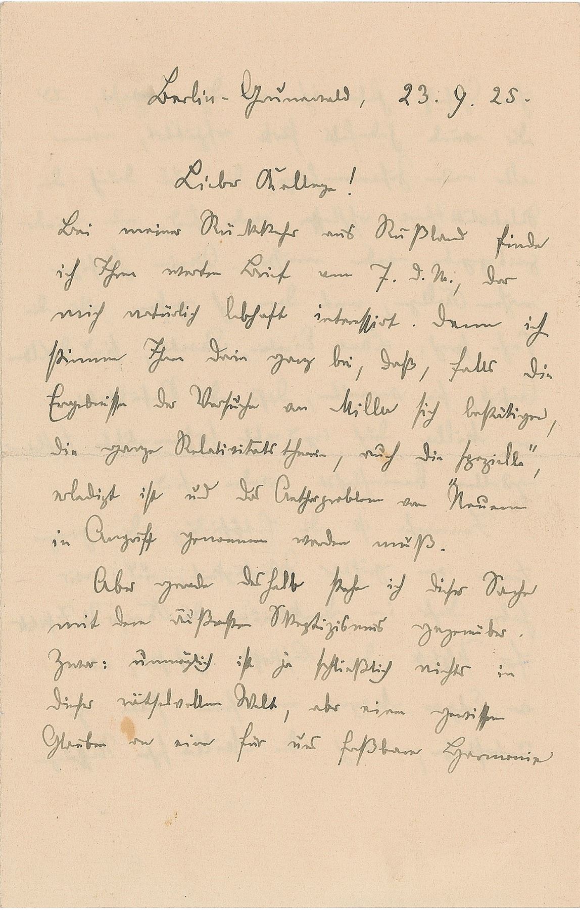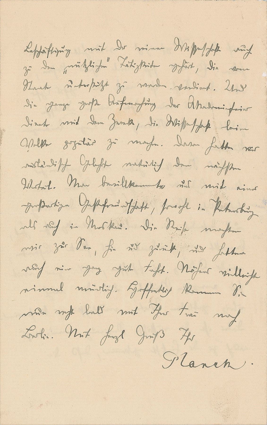 ALS in German, signed “Planck,” four pages on two adjoining sheets, 4.5 x 7, September 23, 1925. Significant letter to physicist Wilhelm Wien, about the ether drift experiments of Dayton C. Miller, who attempted to disprove the Theory of Relativity. Planck himself had just returned from the Soviet Union, where he had been one of the foreign guests of honor at the 200th anniversary of the Russian Academy of Sciences. In part (translated): "I fully agree with you that if the results of Miller's experiments are confirmed, the whole theory of relativity, including the 'special' one, is done and the ether problem must be tackled anew. But for that very reason I am facing this matter with the utmost skepticism. To be sure: after all, nothing is impossible in this enigmatic world, but I have preserved a certain belief in a harmony of its laws that can be grasped by us, and that would certainly be greatly shaken if all the new connections that have been opened up to us by the theory of relativity, now would have to be revealed again. My close-by colleagues here, with whom I spoke yesterday about the matter: Laue, Einstein, Paschen, are of the same opinion, they suspect that the results of Miller have been influenced by any systematic sources of error. After all, the decision of the whole question is of the utmost importance, and we have therefore decided in the Directorate of the Kaiser Wilhelm Faculty of Physics to support a plan drawn up by Edgar Meyer, according to which the Miller measurements on the Jungfraujoch are to be repeated. It will cost a lot of money, but the cause is probably worth a lot of sacrifice…From Russia we have brought many strong impressions. In addition to the terrible devastation left behind by the war and especially the revolution, one is everywhere struck by the strong desire to restore order, and with very energetic means…The Russian government has recently come to the conclusion, that the study of pure science is also one of the 'useful' activities deserving to be supported by the state." In fine condition. Miller's findings were refuted by the measurements carried out by Georg Joss on the Jungfraujoch. An absolutely spectacular letter from a significant period in the development of quantum physics.