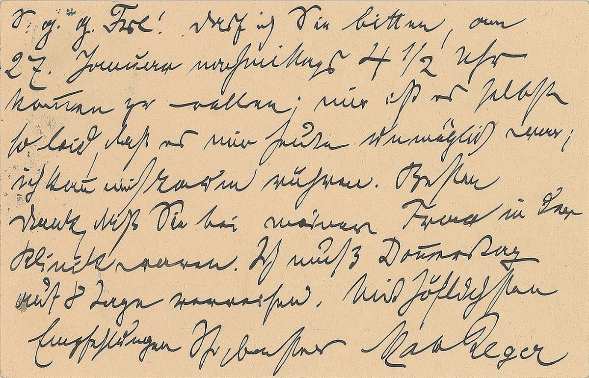 Prolific German composer (1873–1916) best known for his densely contrapuntal, Bach-inspired keyboard works. ALS in German, one page on a 5.5 x 3.5 postcard, no date. Untranslated letter to Frieda Kramer, who edited some of his works. In fine condition. Pre-certified PSA/DNA.