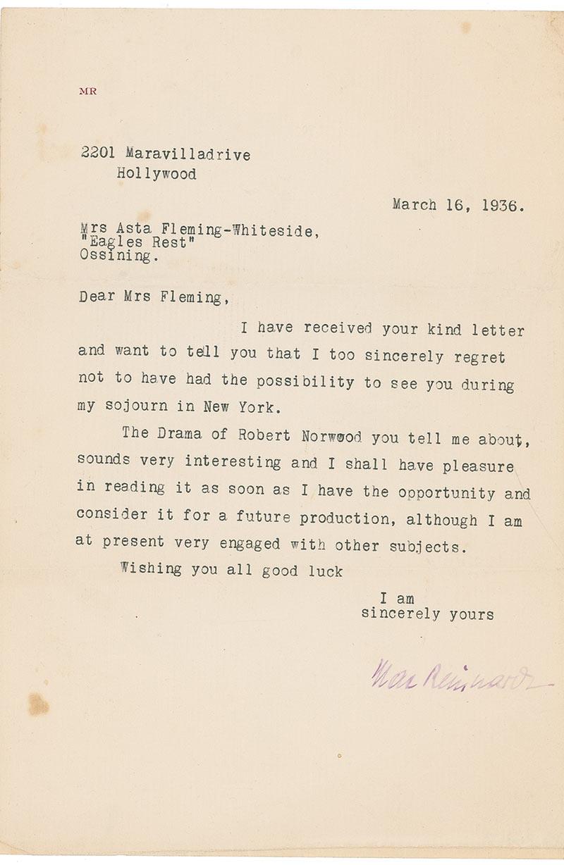 Innovative Austrian-American theater director and actor (1873–1943). TLS, one page, 7 x 10.25, 2201 personal letterhead, March 16, 1936. In part: “I have received your kind letter…regret not to have had the possibility to see you during my sojourn in New York…The drama of Robert Norwood you tell me about, sounds very interesting and I shall have pleasure in reading it as soon as I have the opportunity and consider it for a future production, although I am at presently very engaged with other subjects.” In very good condition, with scattered light toning and spotting, a few creases, and Reinhardt’s signature a couple shades light, but completely legible.