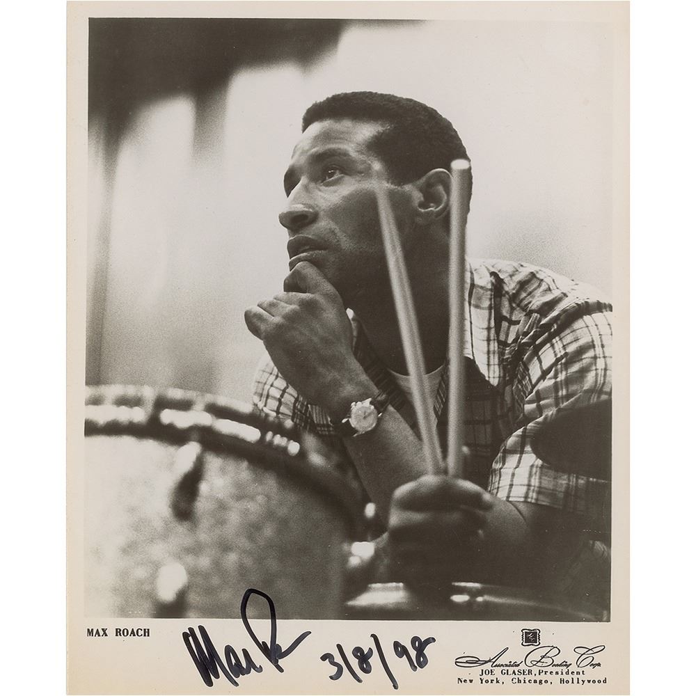 Glossy 8 x 10 publicity photo of the famed jazz drummer sitting behind his kit, signed in the lower border in black felt tip, "Max Roach, 3/8/98." In fine condition, with a crease above Roach's left shoulder.