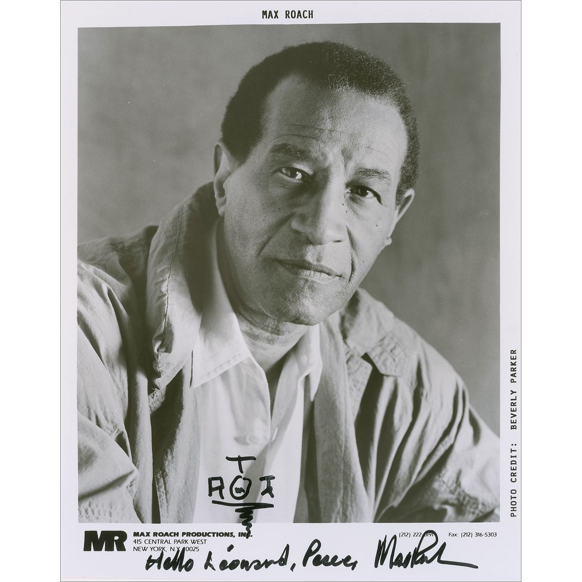 Glossy 8 x 10 publicity photo, signed and inscribed in black felt tip “Hello Leonard, Peace, Max Roach,” with Roach adding a small sketch of a drum kit above the inscription. In fine condition.