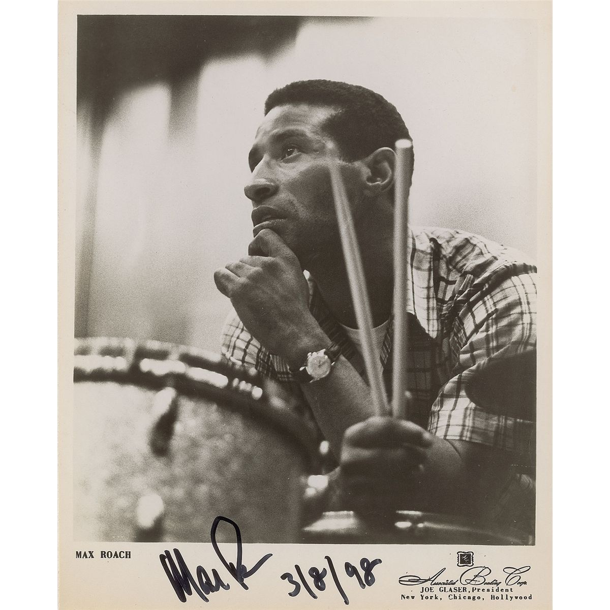 Glossy 8 x 10 publicity photo of the famed jazz drummer (1924-2007) sitting behind his kit, signed in black felt tip, “Max Roach 3/8/98.” In fine condition.