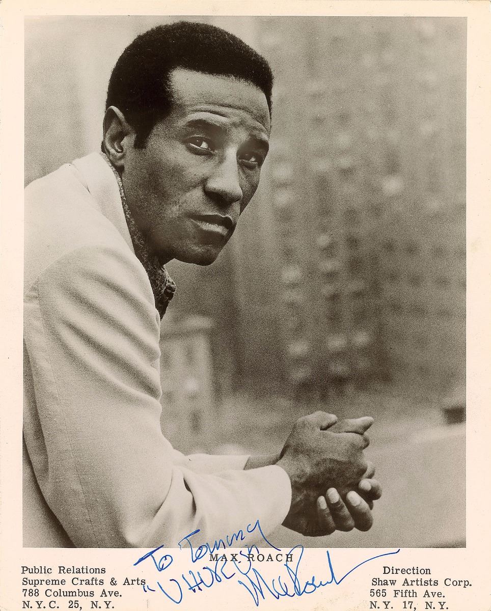 Vintage glossy 8 x 10 publicity photo of Roach with his hands clasped, signed and inscribed in fountain pen, “To Tommy, ‘Uhuru,’ Max Roach.” In fine condition.