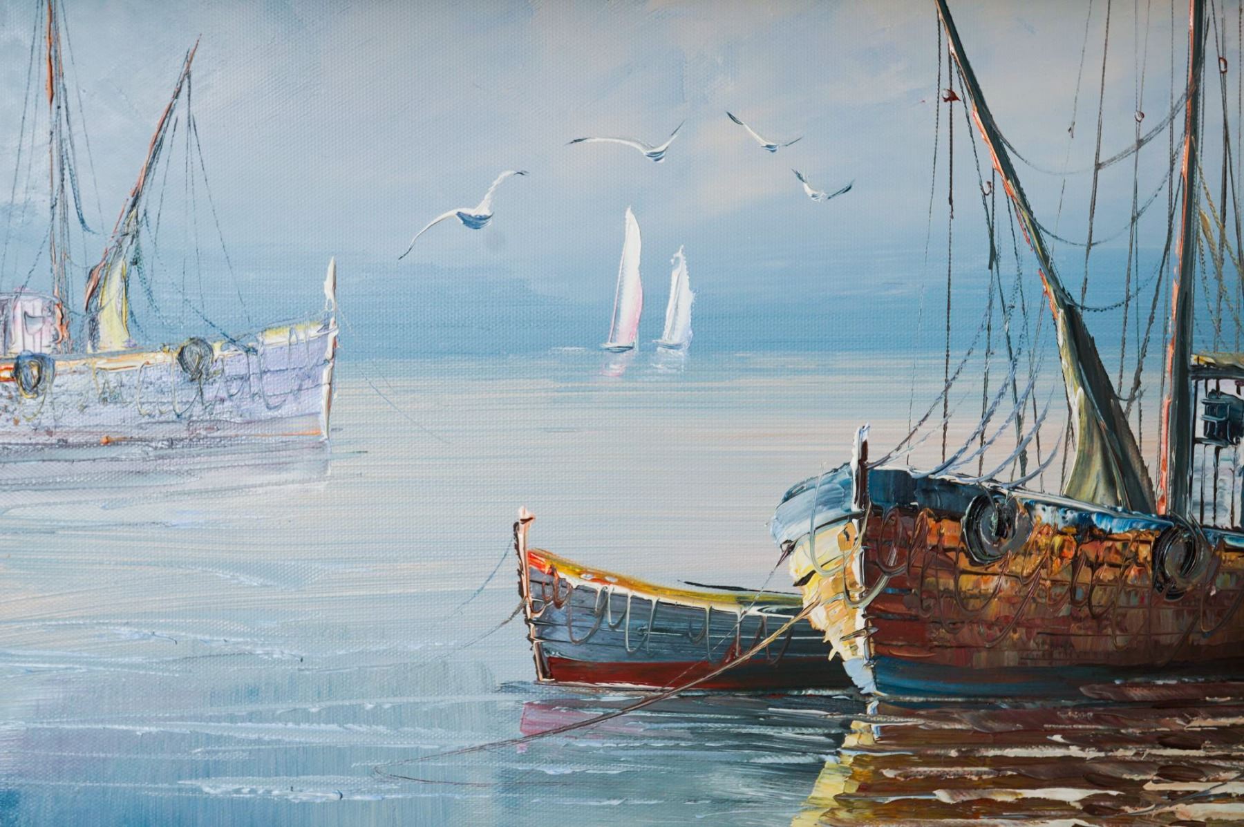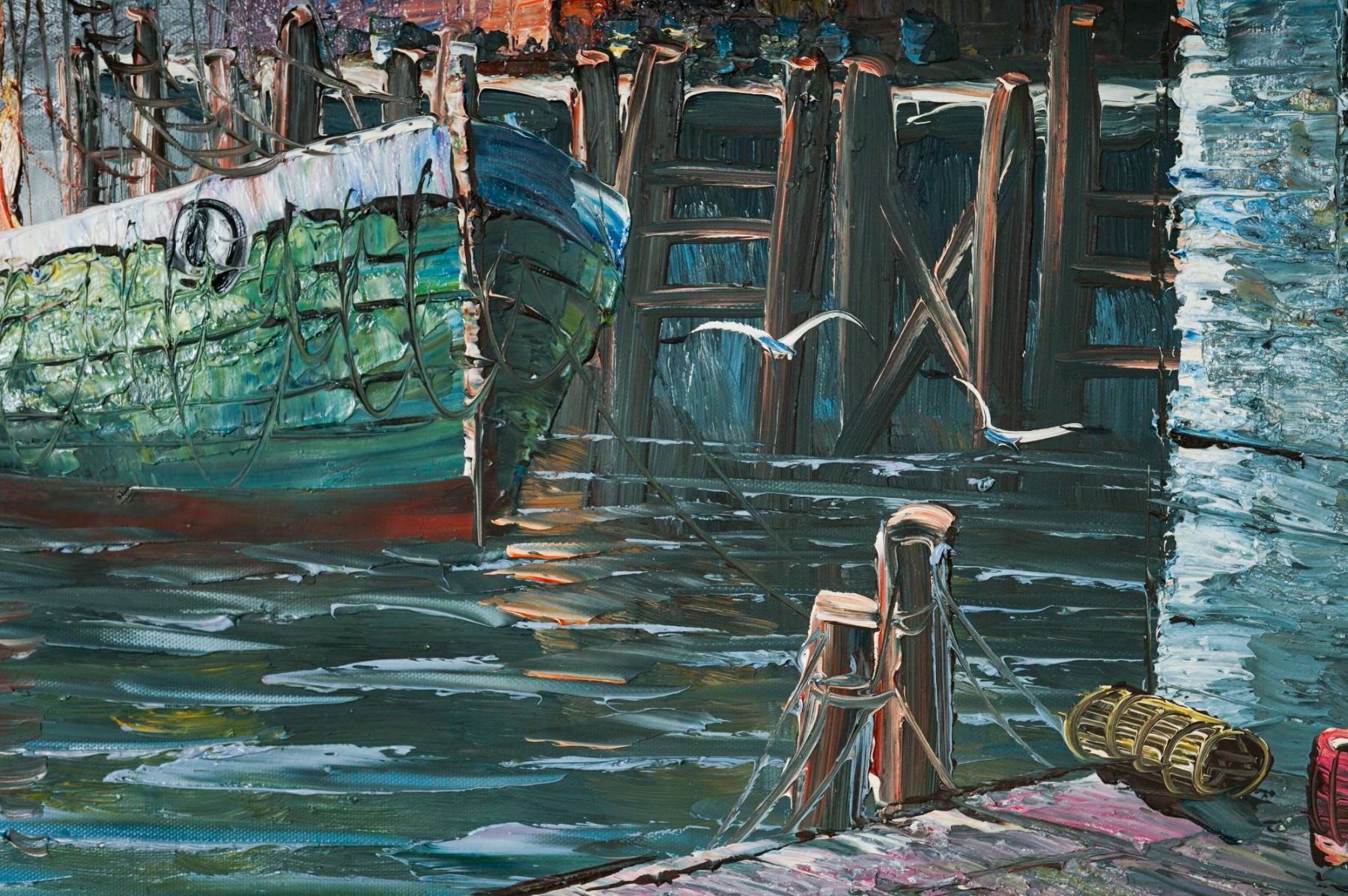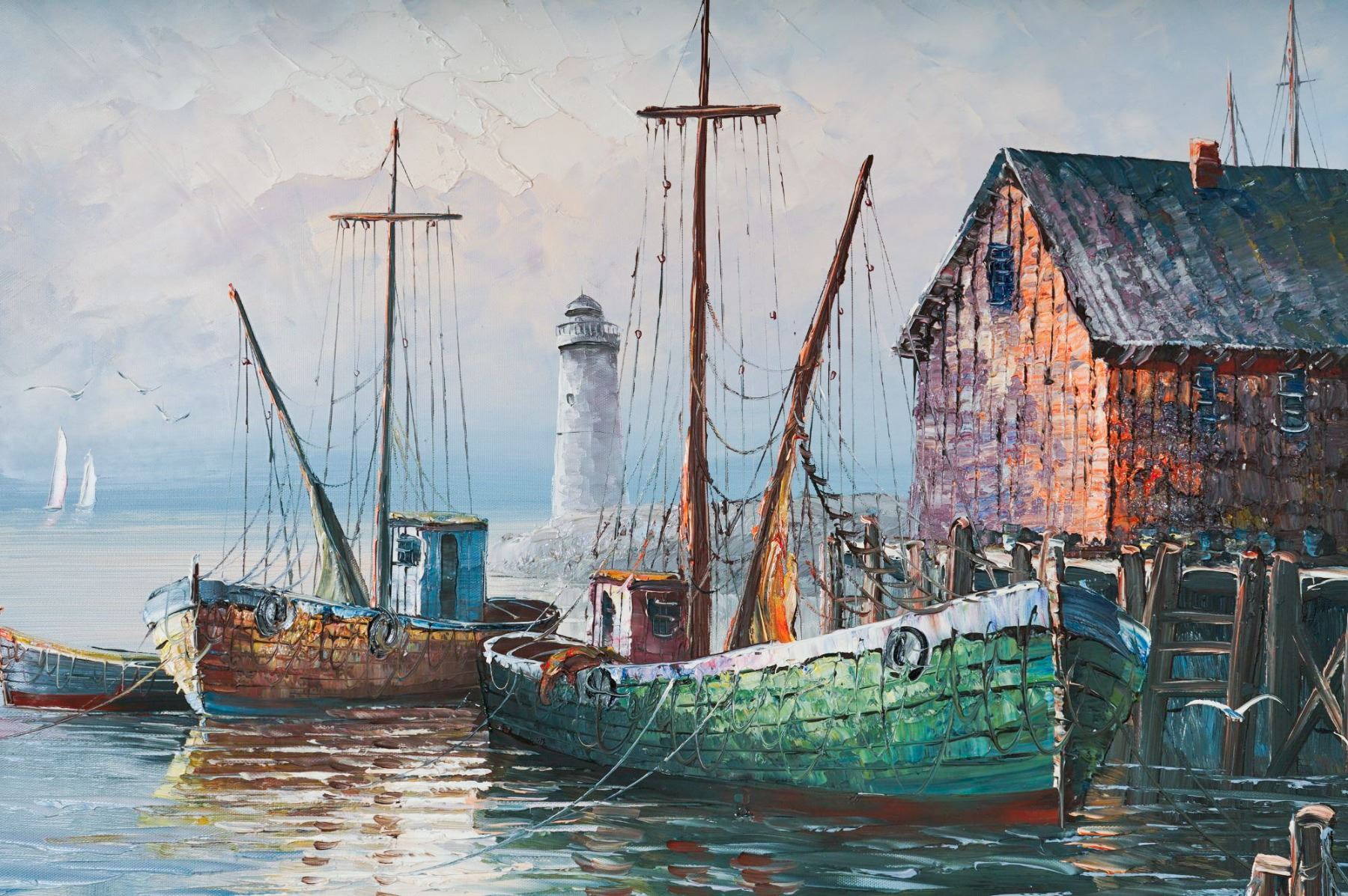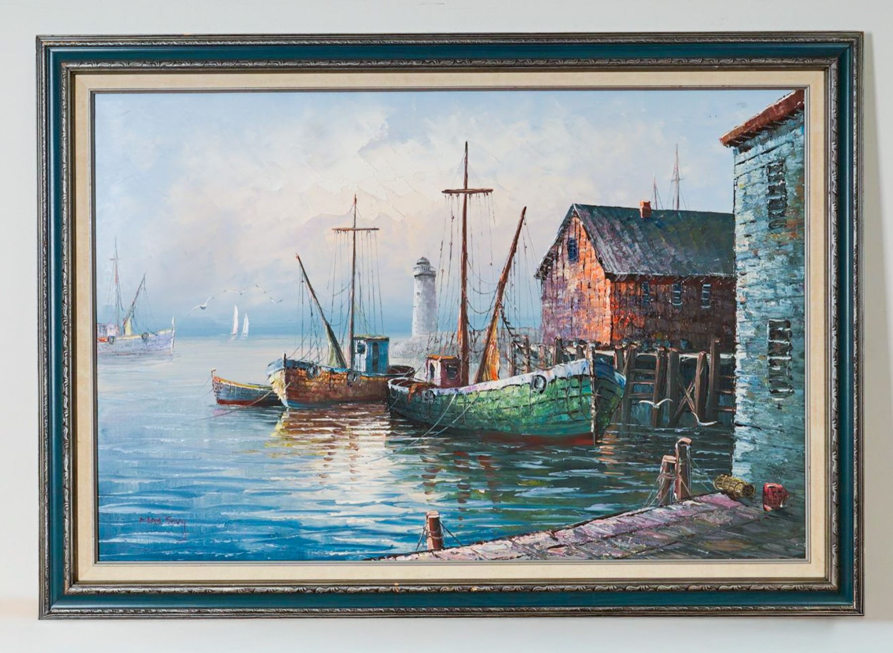A vibrant harbor scene oil painting on canvas by French artist Max Savy. This richly textured composition captures a tranquil coastal village with fishing boats moored at a wooden dock, a lighthouse in the distance, and soft pastel skies reflecting across calm waters. Executed with expressive palette knife work, the piece showcases Savy's mastery of color, light, and atmosphere, hallmarks of his maritime subjects. Signed Max Savy lower left. Presented in a decorative wood frame with linen liner.