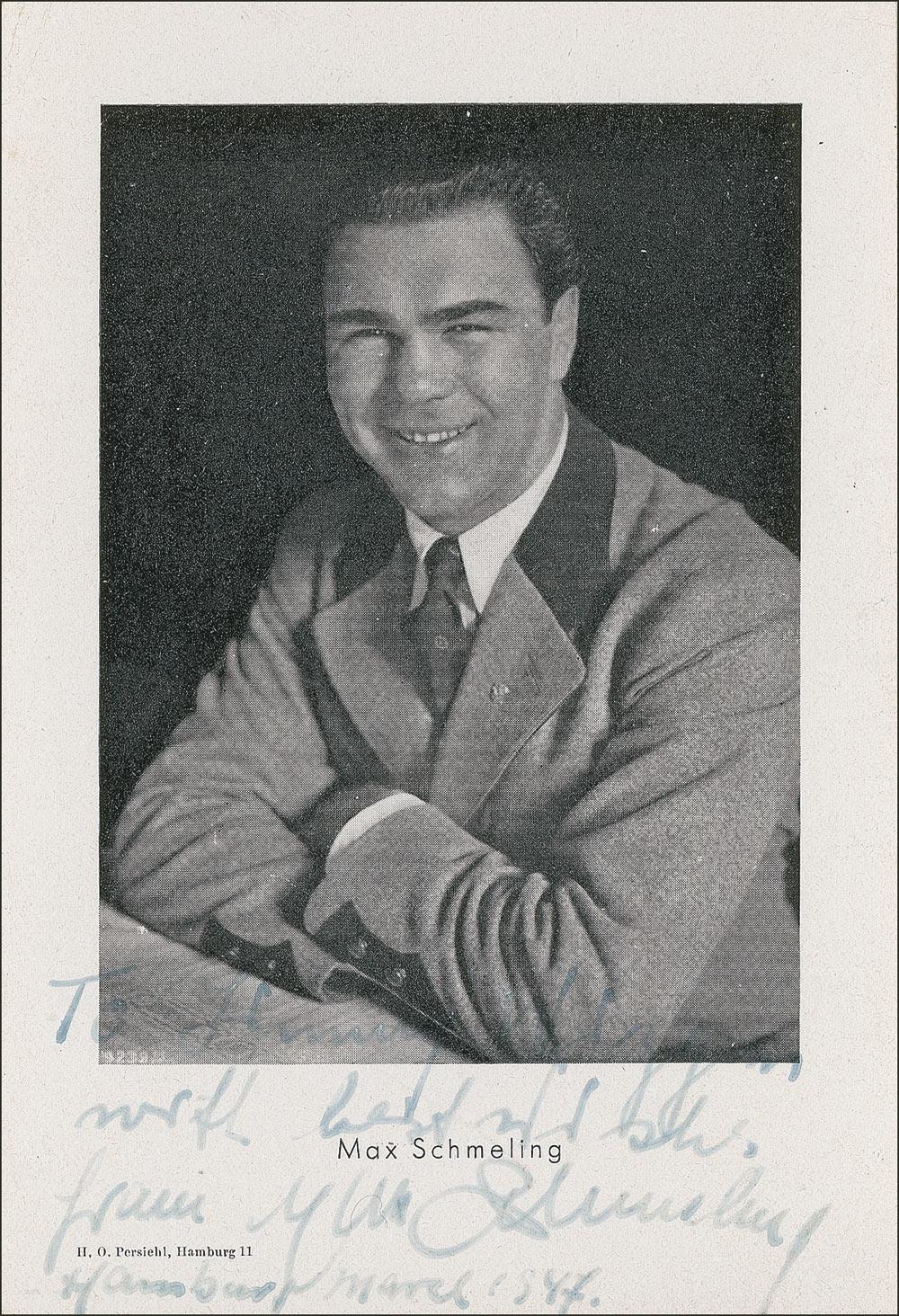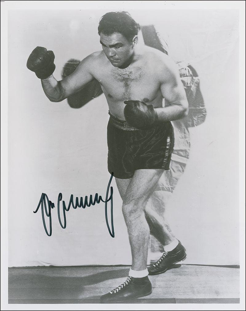 Two signed photos: a vintage 4 x 6 lightweight postcard photo, signed and inscribed in fountain pen and dated 1947; and a glossy 8 x 10 full-length photo, signed in black felt tip. In fine condition, with some light contrast to first line of inscription and signature just a shade or two light to postcard photo.
