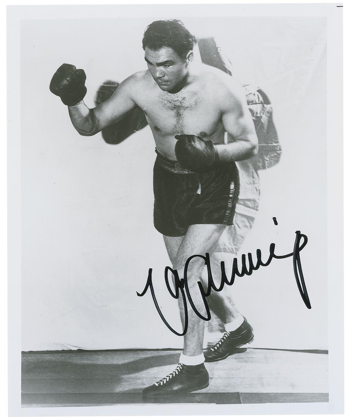 Glossy 8 x 9.75 photo of Schmeling throwing a punch, signed in black felt tip. In fine condition, with a few surface impressions and a spot of residue on his trunks.