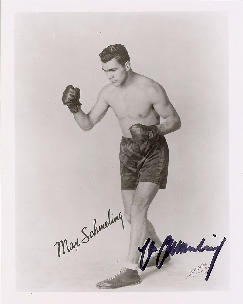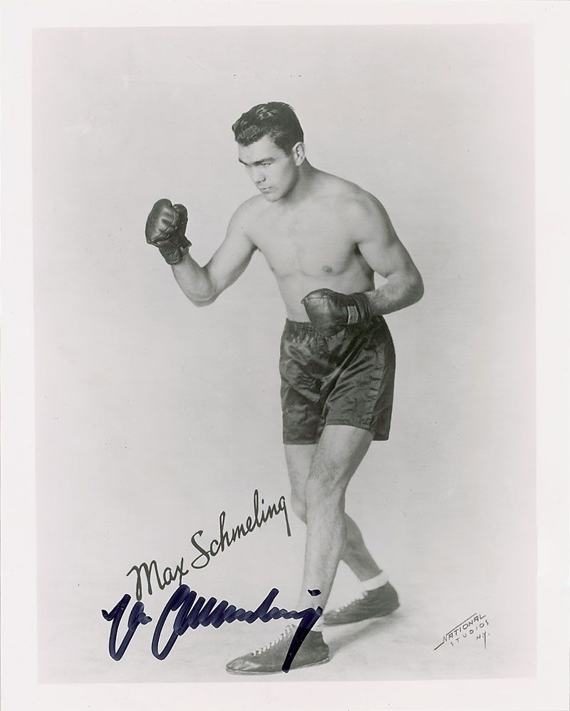 Two identical glossy 8 x 10 photos of Schmeling in his prime, each signed in black felt tip. In very fine condition.