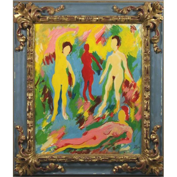 Max Spoerri (American, b. mid-20th century), nudes in abstract landscape, 1978, o/c, 24" x 20", 32" x 28" framed, signed LL. Good condition.