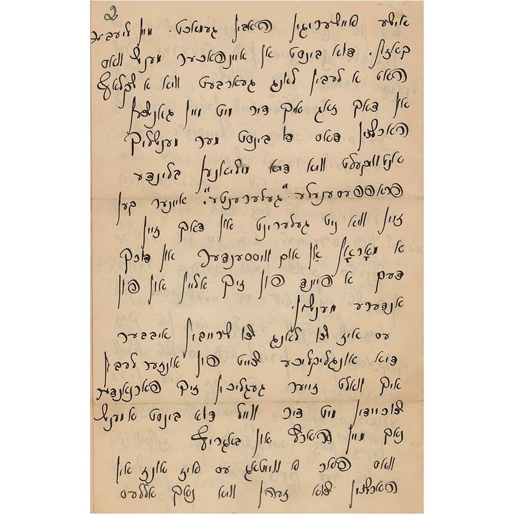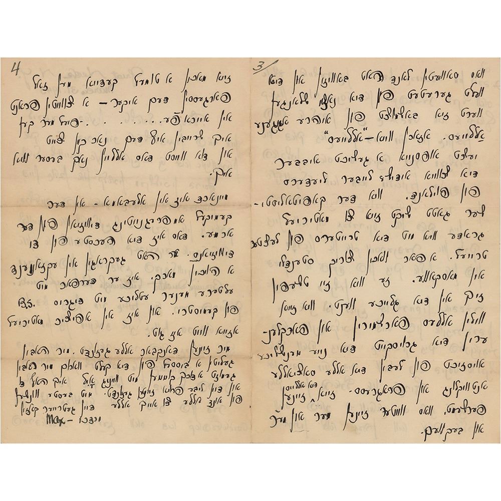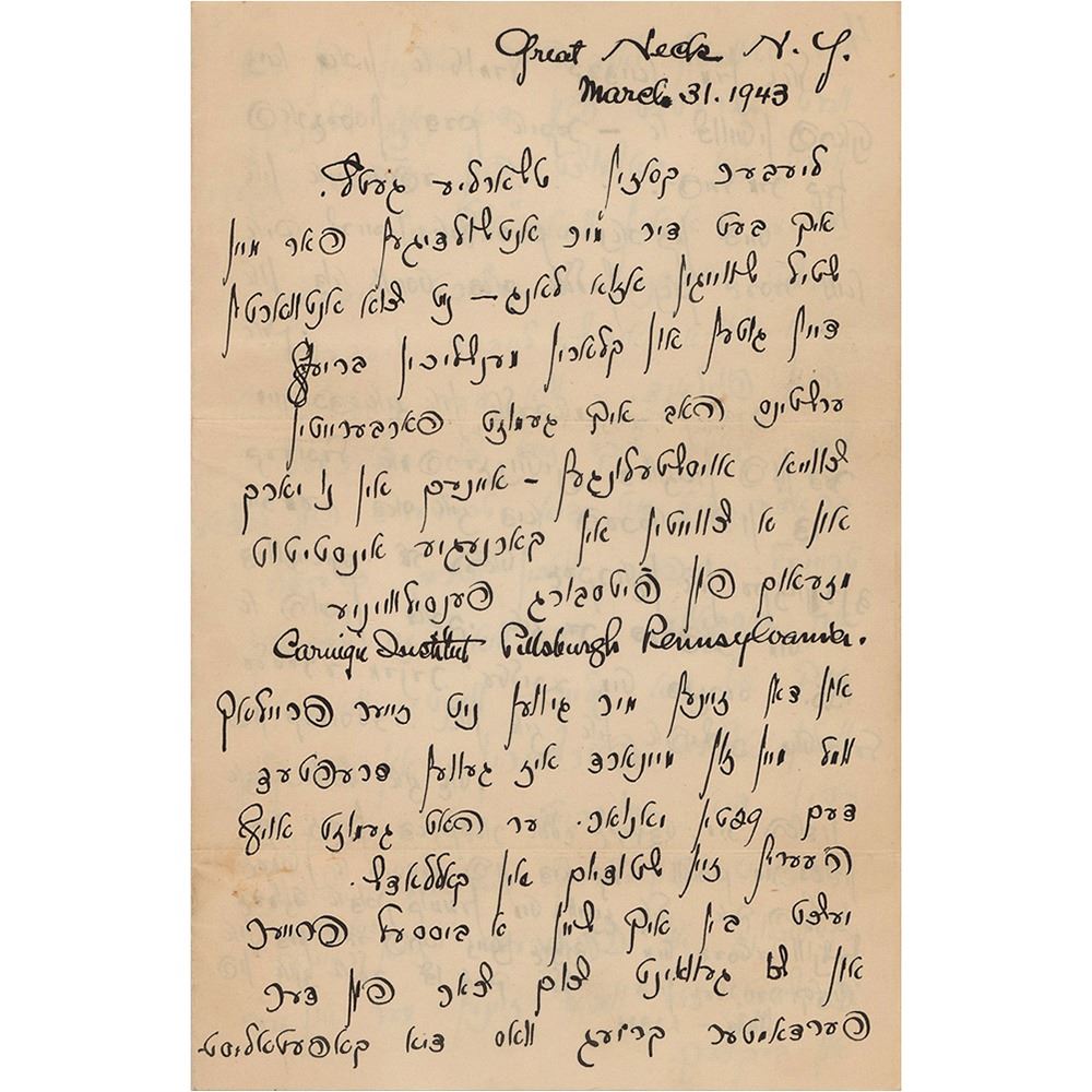 Jewish-American painter (1881–1961) celebrated for his Cubist works on Jewish themes. ALS in Yiddish, signed “Max,” four pages on two adjoining sheets, 5.5 x 8.5, March 31, 1943. Handwritten letter to his cousin, Charles Getz, in part (translated): "I would like to ask you for an apology for my keeping silence that long a time…The first reason to excuse myself is that I had to prepare two exhibitions: one in New York, and the other one for the Carnegie Institute…The other reason is that I was in a bad mood, because my son Meinard was drafted on the 29th January; he had to interrupt his studies in college. Now my state of mind is a little better, and I got used to the thought of the terrible war led by the 'Capitalist locust'…You are a decent man who worked all his life like a slave, anyhow I would like to convey to you that you are (I speak to you from the depths of my heart) a more decent human being than the millions of professional 'intellectuals.' A person can be very learned, and despite his knowledge be a moron, with lack of insight about himself, who becomes an enemy of himself and an enemy of other people…How my heart aches about the fact we witness, that after the accomplishment of the Soviet Union to rescue the world from the Nazi snake, she is being criticized and made fun of by her own allies." In fine condition.