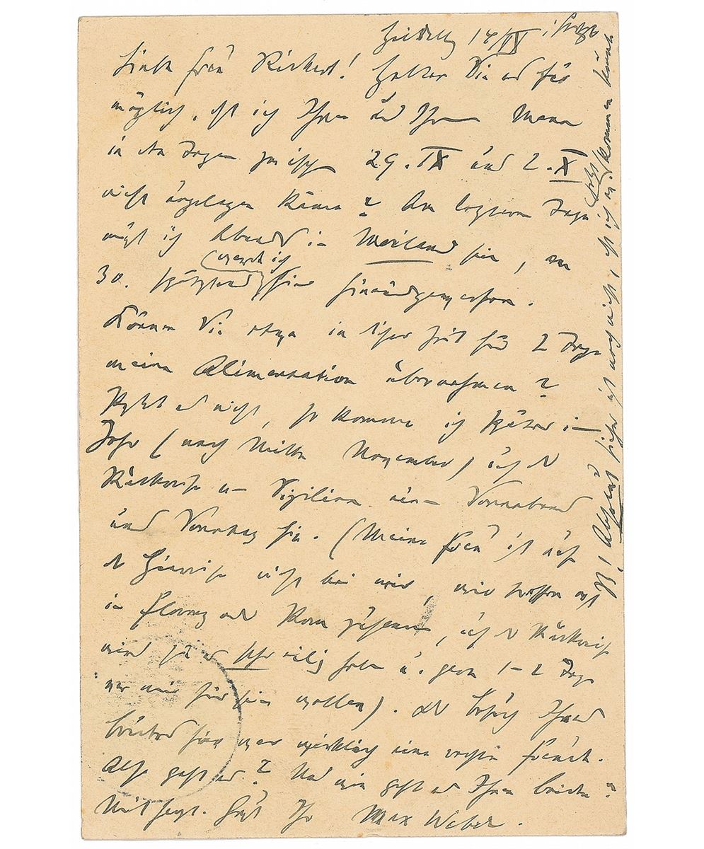 Extremely influential social theorist (1864–1920) often cited with Emile Durkheim and Karl Marx as a founding architect of sociology. ALS in German, one page on a 3.5 x 5.5 postcard, September 14, 1906. Untranslated letter to Sophie, wife of philosopher Heinrich Rickert, in Freiburg, planning a visit. In fine condition, with a bit of show-through to the lower left from the postmark. Heinrich Rickert, a leading neo-Kantian philosopher, was Weber’s colleague at the University of Freiburg and introduced him to his ideas, which had a large impact. Especially influential on Weber’s work was the neo-Kantian belief that reality at its core is chaotic and incomprehensible, with all rational order deriving from human focus and perception.