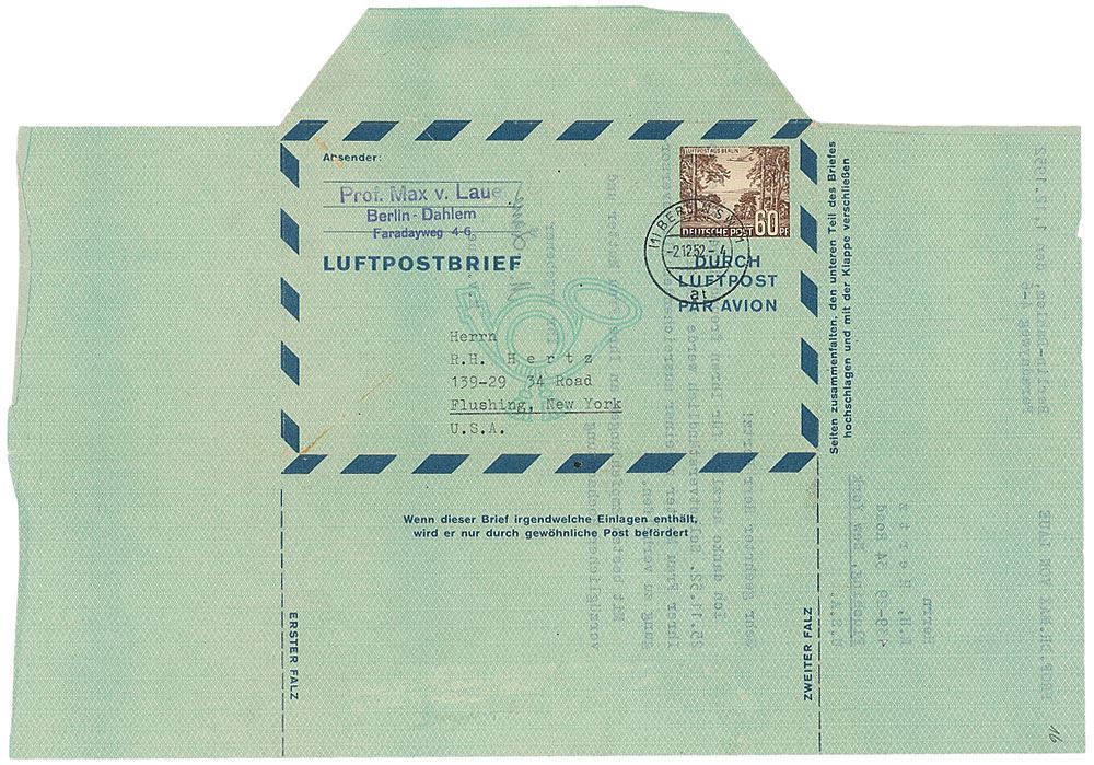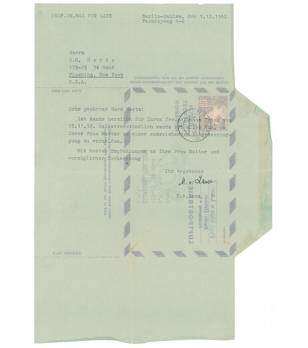 German physicist (1879–1960) who won the 1914 Nobel Prize in Physics for his research related to the diffraction of X-rays by crystals. TLS in German, signed “M. v. Laue,” one page, 6.75 x 11.5, luftpostbrief letterhead, December 1, 1952. Letter to R. H. Hertz of Flushing, New York. Untranslated letter thanking him and offering to help a relative obtain an adequate pension. In fine condition, with intersecting folds.