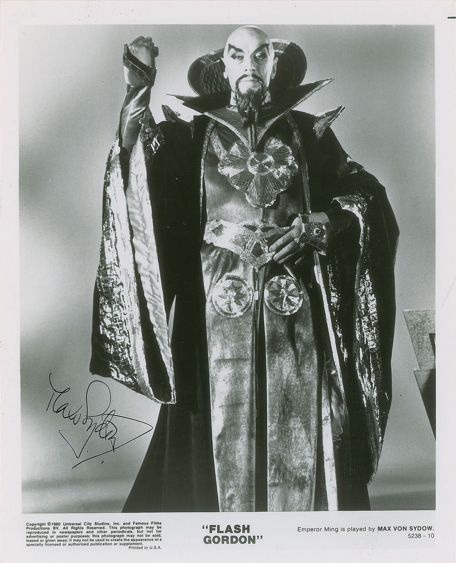 Glossy 8 x 10 publicity photo of Max von Sydow as the evil Emperor Ming in the 1980 film Flash Gordon, signed in black ink. In fine condition.