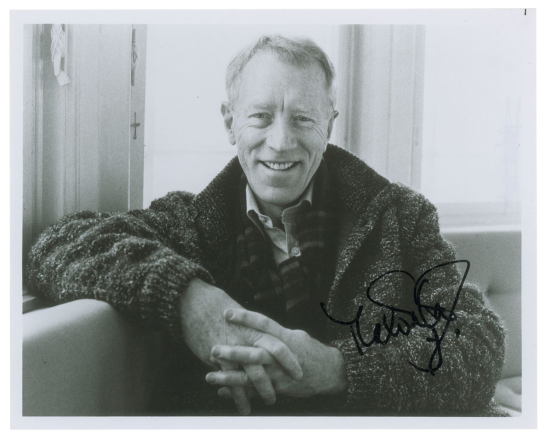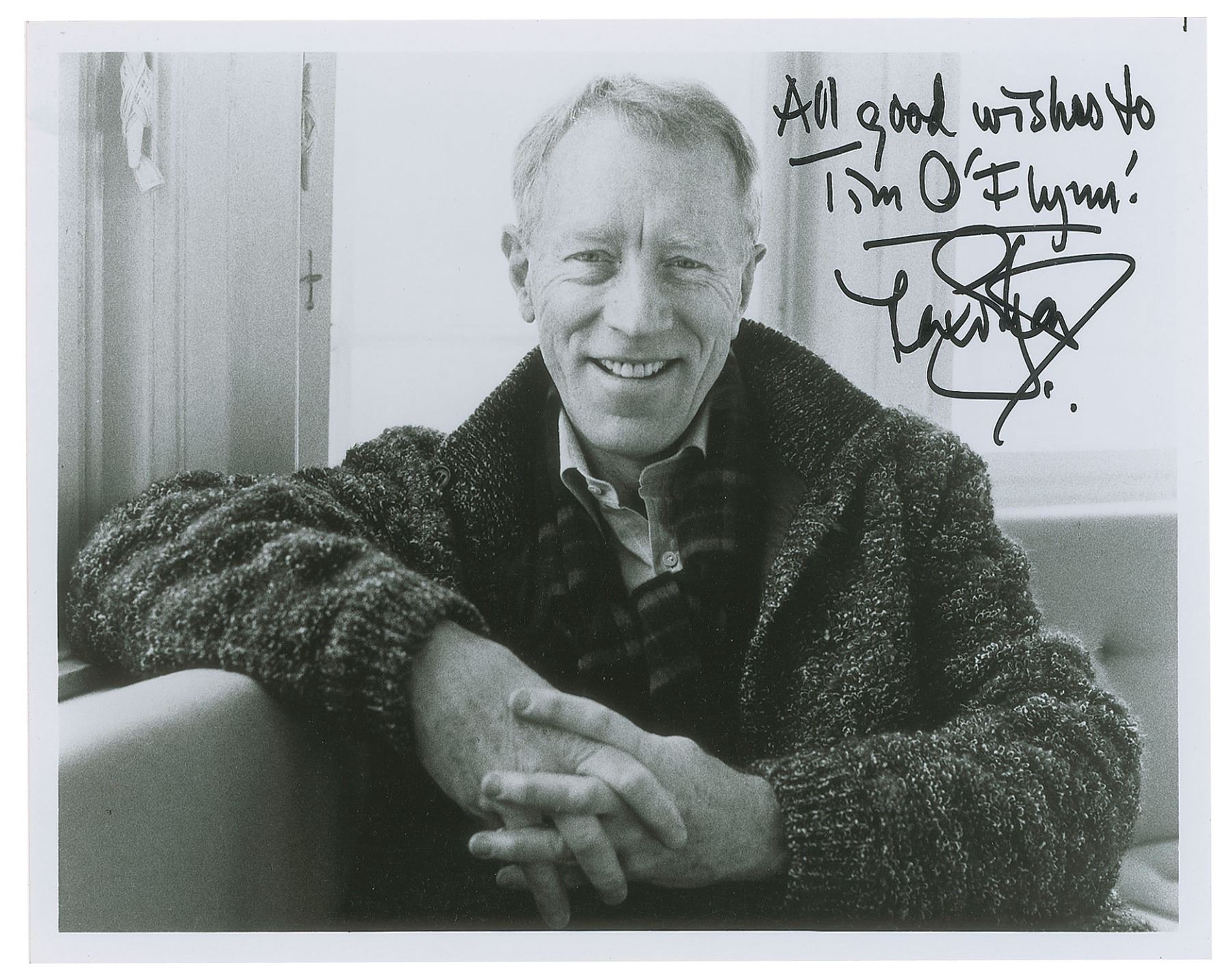 Two identical glossy 10 x 8 photos: one signed in black felt tip over a dark portion of the image, “Max von Sydow”; and one signed and inscribed in black felt tip against the light background, “All good wishes to Tim O’Flynn! Max von Sydow.” In overall fine condition, with aforementioned light contrast to the signature on the uninscribed photograph.