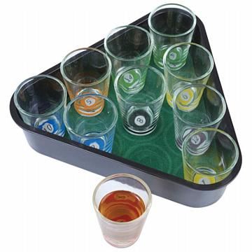 Maxam 11pc Pool Drinking Game Set **|**|** Rack"em up"! Just bounce a coin off the table and into a pool ball-numbered shot glass, then drink to your success. This is the party way to play pool! The game features a "rack-style" tray and 10 pool ball-numbered shot glasses. Measures 8-1/2" x 7-7/8" x 2"