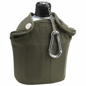 Maxam 32oz Aluminum Canteen with Cover and Cup **|**|** The indispensable sidekick for your next outdoor excursion, this handy canteen lets you bring along 32oz of clean, cold water to quench your thirst during the day's activities. The Maxabiner clip lets you hook the canteen right onto your gear, and the cotton cover adds an extra layer of insulation. Pull the canteen out of the handled cup and you have an additional drinking source. Features chained lid and 20oz cup. Measures 4-7/8" x 7" x 2-5/8".