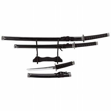 Maxam 4pc Sword Set with Stand **|**|** Set includes: sword set with wooden stand, 21"; sword with 10"; blade and sheath, 30"; sword with 17-1/2"; blade and sheath, and 40"; sword with 25-1/2"; blade and sheath. Each sword has Katana-style handle. Limited lifetime warranty