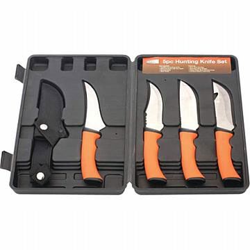 Maxam 5pc Hunting Knife Set **|**|** Set includes: traditional hunting knife; skinning knife with gut hook; boning knife; work knife; and nylon sheath in a heavy-duty, blow-molded storage case. Knives feature fixed stainless steel blades and sure-grip handles. Knives measure 10-5/8" overall, with 5" blades. Case measures 14-3/4" x 9" x 2". Limited lifetime warranty.