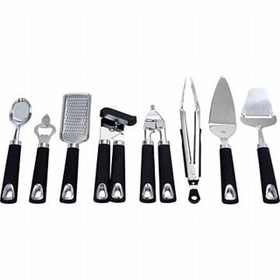 Maxam. 8pc Stainless Steel Kitchen Tool Set **|**|** Set includes: tongs, ice cream scoop, can opener, bottle opener, garlic press, grater, cheese slicer/server, and cake server with serrated edge. Features mirror finish, soft-grip handles, and handy hang-up design. Tongs measure 10-1/2". Limited lifetime warranty.