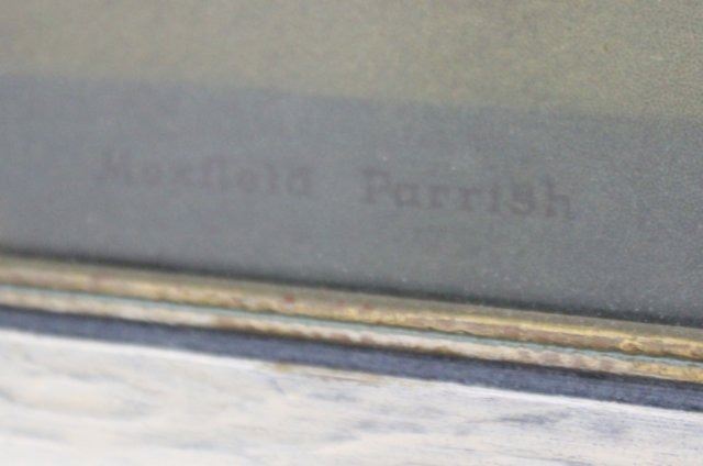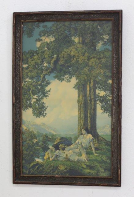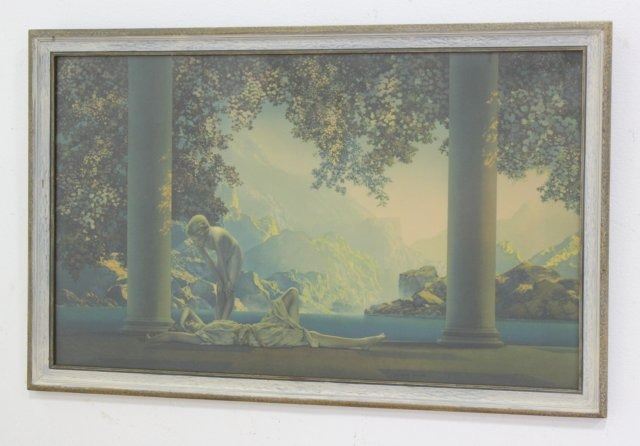 "Daybreak," signed in plate, approx. 17 1/2" H x 29 1/2" W sight, 20 1/2" H x 32 1/2" W framed. Two figures, marked The House of Art, approx. 19 1/2" H x 11 1/2" W sight, 22" H x 14" W framed. Maxfield Parrish (1870-1966).