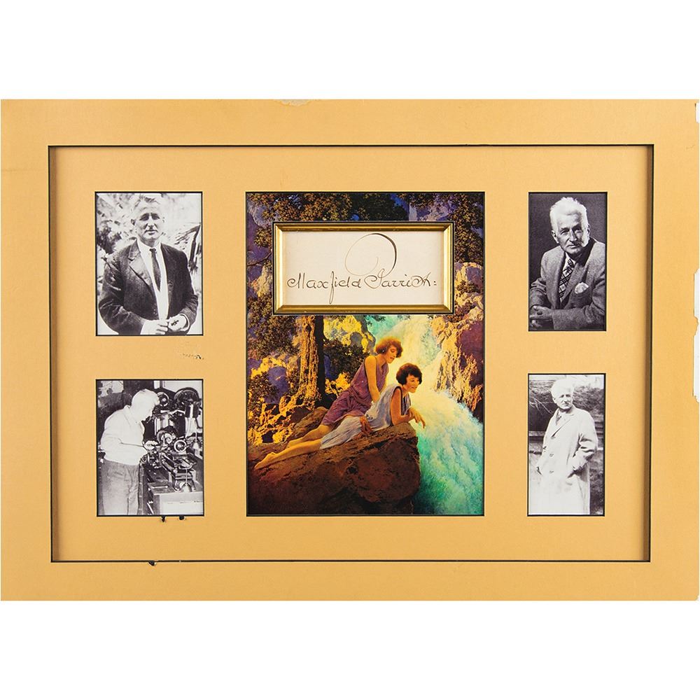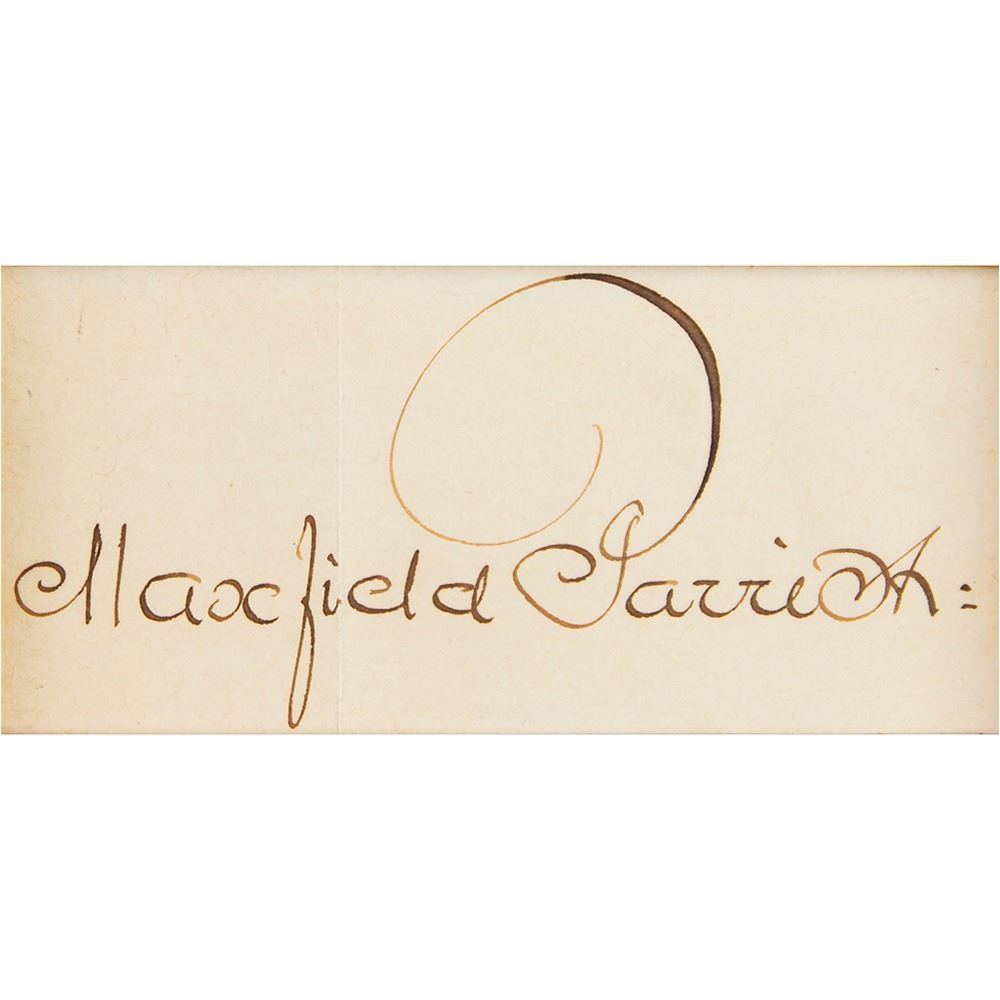 Attractive fountain pen signature, "Maxfield Parrish,” on an off-white 4 x 1.75 sheet. Matted with an art print and four images of Parrish to an overall size of 17.5 x 13. In fine condition, with some light wrinkling.