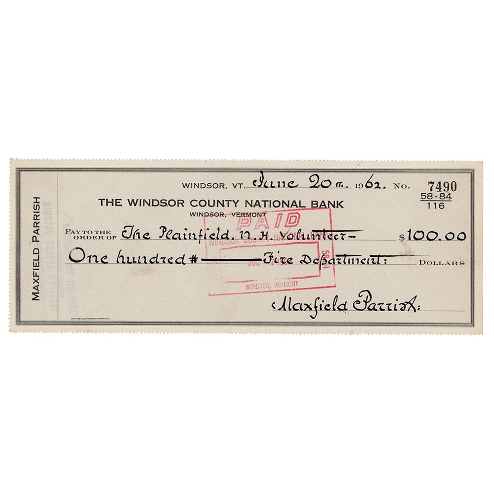 Personal check, 8.25 x 3, filled out and signed by Maxfield Parrish, payable to The Plainfield. N.H. Volunteer Fire Department for $100, June 20, 1962. In fine condition.