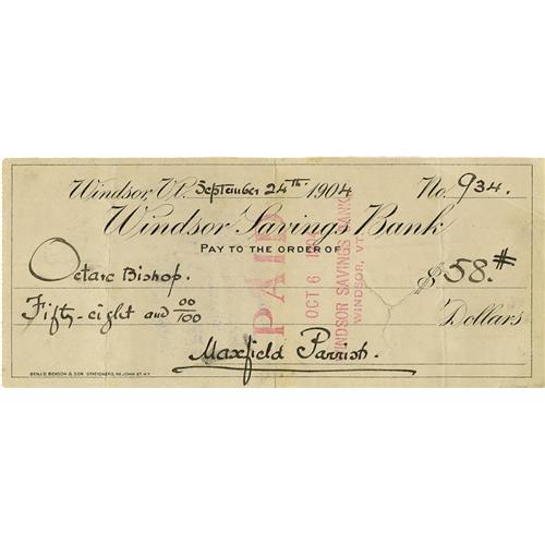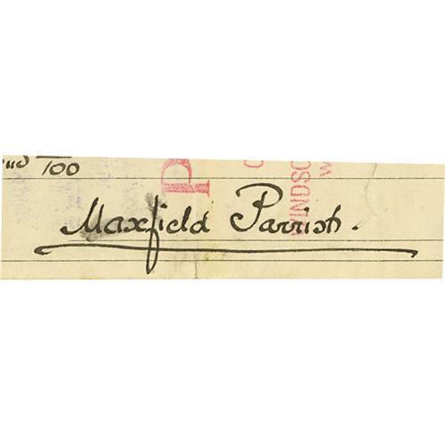 <B>Maxfield Parrish Signed Personal Check.</B></I> <I>Maxfield Parrish,</B></I> 6.25" x 2.75", np, September 24, 1904. Written in his hand and boldly signed. Several subtle creases and one small tear detract minimally from nice overall appearance. Fine condition; not a common signature.