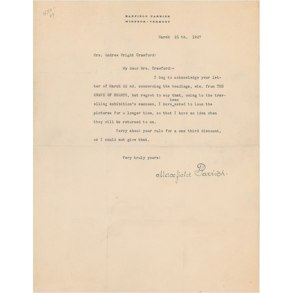 TLS, one page, 8.5 x 11, personal letterhead, March 25, 1927. Letter to Mrs. Andrew Wright Crawford, the director of The Print Center in Philadelphia. In full: "I beg to acknowledge your letter of March 22nd concerning the headings, etc. from The Knave of Hearts, but regret to say that, owing to the travelling exhibition's success, I have been asked to loan the pictures for a longer time, so that I have no idea when they will be returned to me. Sorry about your rule for a one third discount, as I could not give that." In very good to fine condition, with intersecting folds.