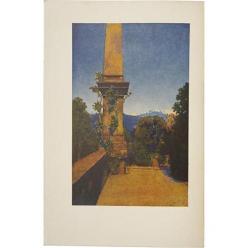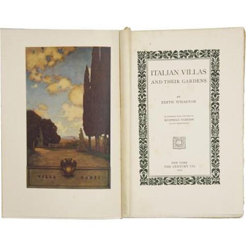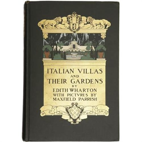 <B>[Maxfield Parrish, illustrator]. Edith Wharton. </B></I><B><I>Italian Villas and Their Gardens</B></I></B></I><B>.</B></I> New York: The Century Company, 1904. <BR>First edition. Large octavo (10.4375 x 7.0625 inches). xii, 270 pages. Fifty-two illustrations, including forty-five plates (fifteen of which are color), with captioned tissue guards printed in red, and seven text illustrations. Twenty-six of the plates are after drawings by Maxfield Parrish. Printed in red and black.<BR><BR>Original dark green cloth pictorially stamped and lettered in gilt on spine. Top edge gilt, others uncut. Just slightly skewed, extremities lightly rubbed, corners lightly bumped. Light foxing to endpapers, title-page, and frontispiece tissue guard, tissue guard lightly creased. Previous owner's ink presentation inscription, dated Christmas 1904, on recto of frontispiece. A very good copy.<BR><BR>"The 1904 publication of <I>Italian Villas and Their Gardens</B></I> followed <I>Poems of Childhood </B></I>by about two months. With text by Edith Wharton and pictures by Maxfield Parrish, the volume represented a genuine collaborative effort between the two. Each traveled to Italy to gather material for the project; later they met in Lenox, Massachusetts, to compare notes and to discuss the points of view to be taken in the publication. First serialized in <I>The Century Magazine</B></I> and then released in book form, <I>Italian Villas and Their Gardens</B></I> provided an avenue of expression for Parrish's architectural interests, as well as for his growing desire to paint landscapes. The paintings, as a result, were a sensitive and striking departure from his more fanciful work, to which the public had grown accustomed" (Coy Ludwig, <I>Maxfield Parrish</B></I>, p. 32).<BR><BR>Ludwig, p. 206.<BR><BR><BR><b>Shipping:</b> Books & Catalogs (<a target="_blank" href="http://www.heritageauctions.com/common/shipping.php">view shipping information</a>)
