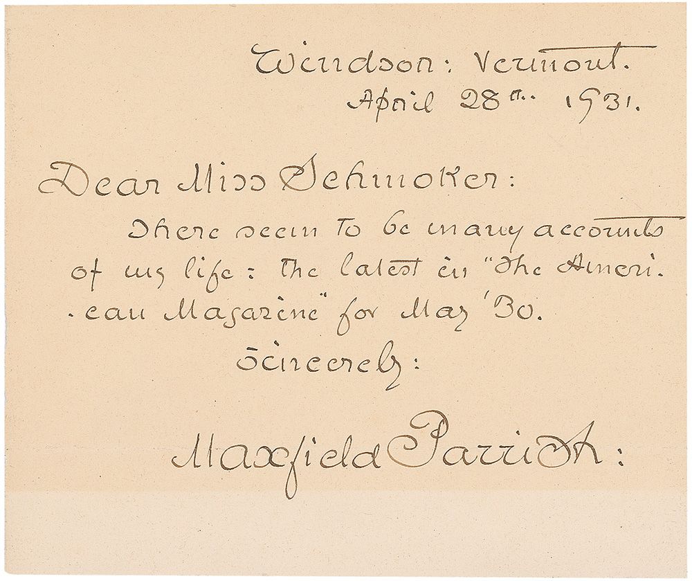 American artist (1870–1966) best known for his luminous, often fantastic landscapes and romantic illustrations of nudes. ALS, one page, 5.5 x 4.5, April 28, 1931. Brief letter to a woman. In full: “There seem to be many accounts of my life: The latest in ‘The American Magazine’ for Mar ‘30.” A uniform block of light toning over text and signature from previous display, and a horizontal fold passing through signature, otherwise fine condition.