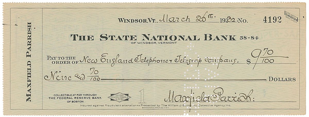 Personal check, 8.25 x 3, filled out and signed by Parrish, payable to the New England Telephone & Telegraph Company for $9.70, March 26, 1932. A central vertical fold and expected cancellation holes affecting the middle of the signature, otherwise fine condition.