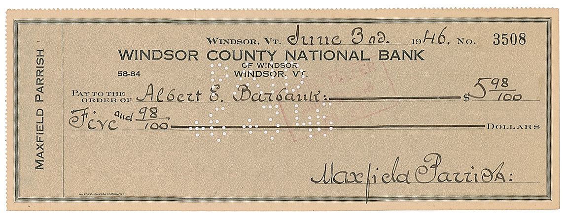 Personal check, 8.25 x 3, filled out and signed by Maxfield Parrish, payable to Albert E. Burbank for $5.98, June 3, 1946. In fine condition.