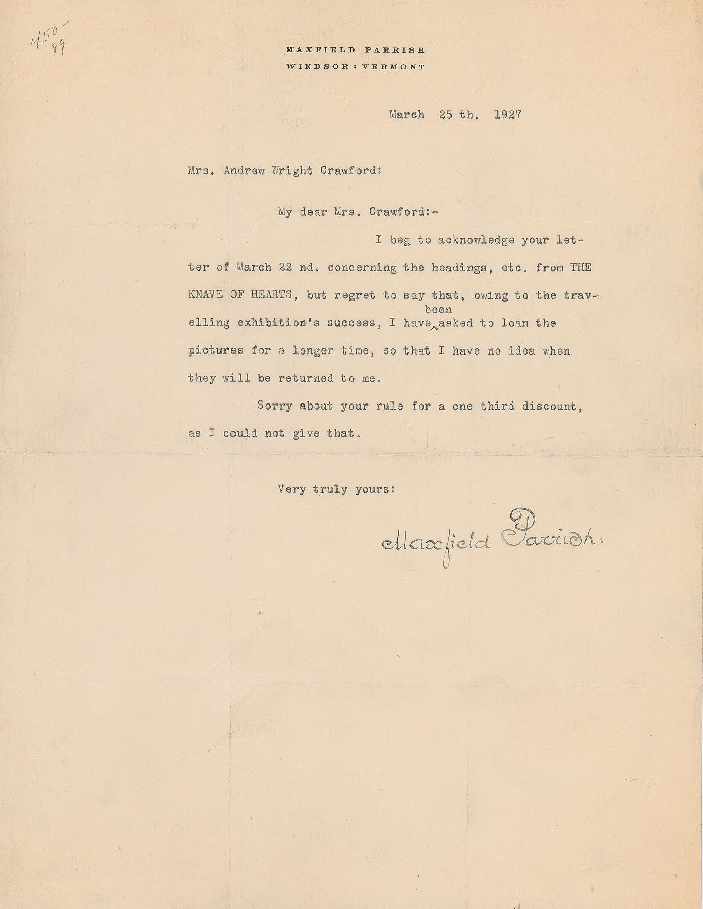 TLS, one page, 8.5 x 11, personal letterhead, March 25, 1927. Letter to Mrs. Andrew Wright Crawford, the director of The Print Center in Philadelphia. In full: "I beg to acknowledge your letter of March 22nd concerning the headings, etc. from The Knave of Hearts, but regret to say that, owing to the travelling exhibition's success, I have been asked to loan the pictures for a longer time, so that I have no idea when they will be returned to me. Sorry about your rule for a one third discount, as I could not give that." In very good to fine condition, with intersecting folds.