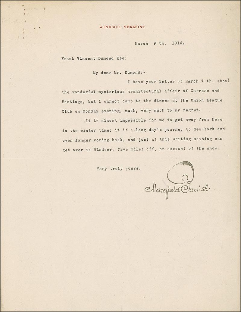 TLS, one page, 8.25 x 11, March 9, 1916. Parrish writes to fellow artist Frank Vincent Dumond (1865–1951). In part: “I have your letter…about the wonderful mysterious architectural affair of Carrere and Hastings, but I cannot come to the dinner at the Union League Club on Monday evening…. It is almost impossible for me to get away from here in the winter time: it is a long day’s journey to New York and even longer coming back, and just at this writing nothing can get over in Windsor, five miles off, on account of the snow.” Staple holes, mild wrinkling, and a few small edge tears and tiny spots, otherwise fine condition. Pre-certified PSA/DNA and RRAuction COA.