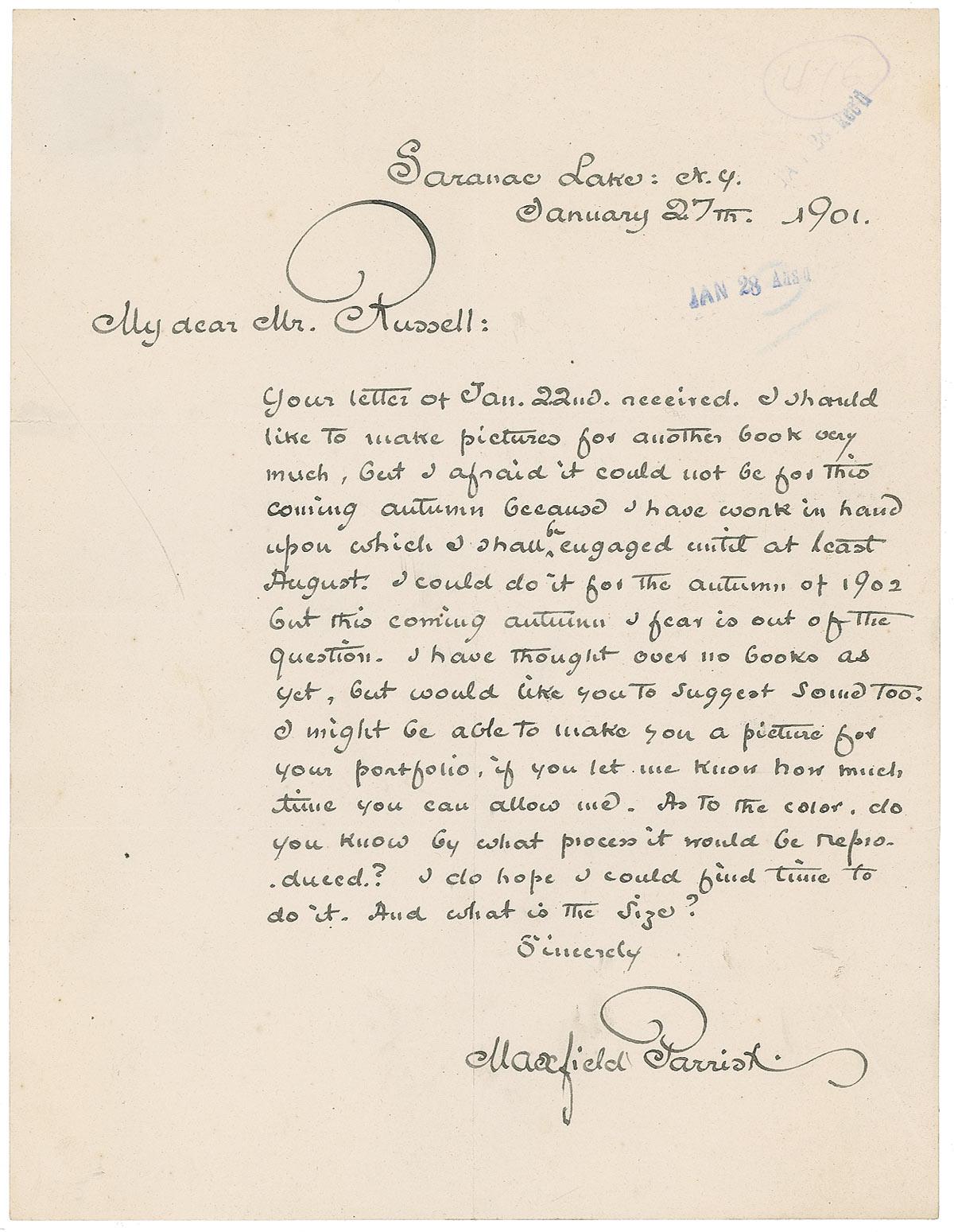Beautifully penned ALS, one page, 7.75 x 10.25, January 27, 1901, to Mr. Russell. In full: “Your letter of Jan. 22nd received. I should like to make pictures for another book very much, but I [am] afraid it could not be for this coming autumn because I have work in hand upon which I shall be engaged until at least August. I could do it for the autumn of 1902 but this coming autumn I fear is out of the question. I have thought over 110 books as yet, but would like you to suggest some too. I might be able to make you a picture for your portfolio, if you let me know how much time you can allow me. As to the color, do you know by what process it would be reproduced? I do hope I could find time to do it. And what is the size?” Intersecting folds, one passing through the first letter of his signature, light wrinkling, two date stamps, and show-through at upper left corner from mounting residue on the back, otherwise fine condition.