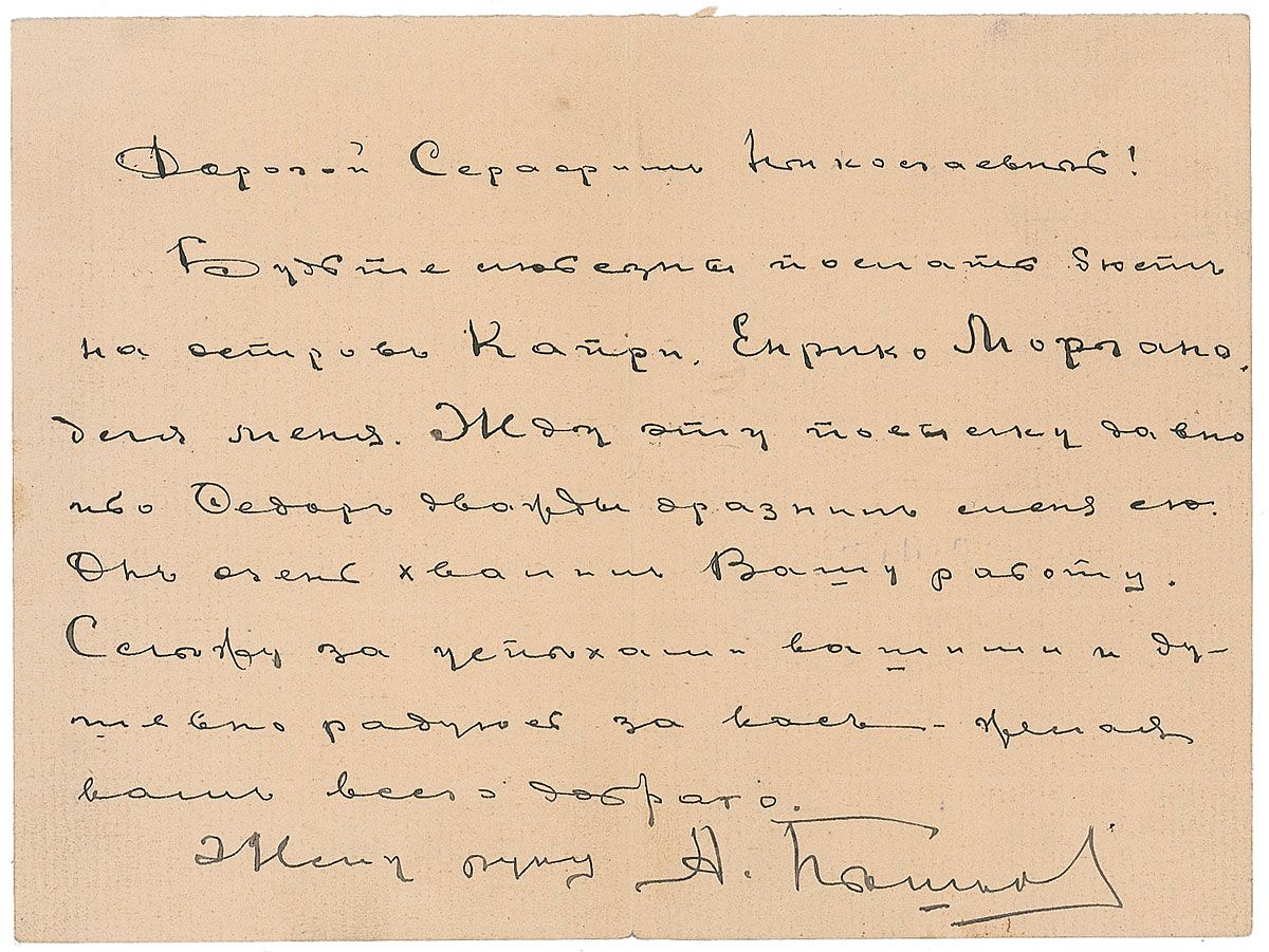 Important Russian/Soviet author and activist (1868–1936). Though his criticism of the Communist government led to a relationship marked by conflict and unease, he was ultimately embraced (though closely monitored) by the Stalinist regime, and Stalin himself was a pallbearer at Gorki’s funeral. ALS in Russian, signed “A. Peshkov,” one page, 7 x 5, no date. Untranslated letter to Seraphim Nikolaievitch asking him to send him a bust to Capri. In fine condition, with a central vertical fold.