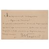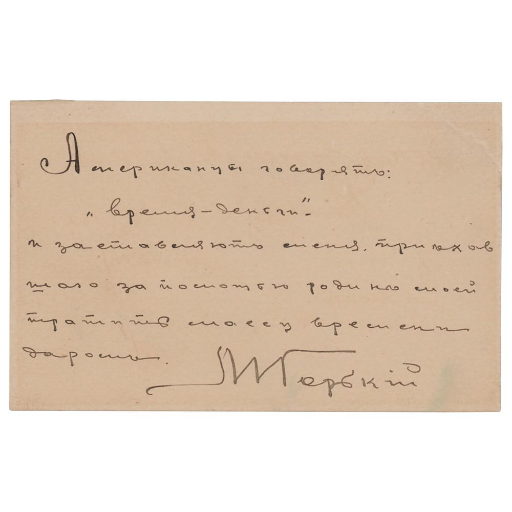 AQS in Cyrillic on an off-white 4.5 x 3 card, signed at the conclusion in fountain pen by Gorky. In full (roughly translated): "Americans say 'Time is Money.' I have spent much time in vain in your country." In fine condition, with a repaired upper right corner, and faint toning from prior display.