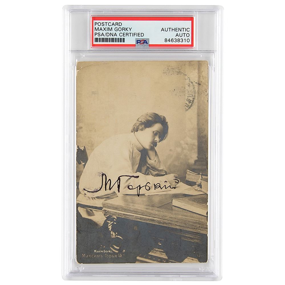 Spectacular vintage matte-finish 3.5 x 5.25 postcard photo of the celebrated writer hard at work, boldly signed in ink in Cyrillic, "M. Gorki." Addressed in another hand to a collector in Prague. In very good to fine condition, with light brushing to the start of the signature, and a postal cancellation to the upper right corner. Encapsulated in a PSA/DNA authentication holder.