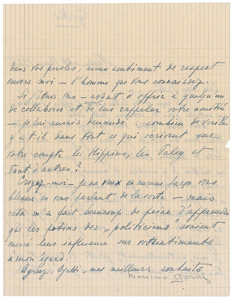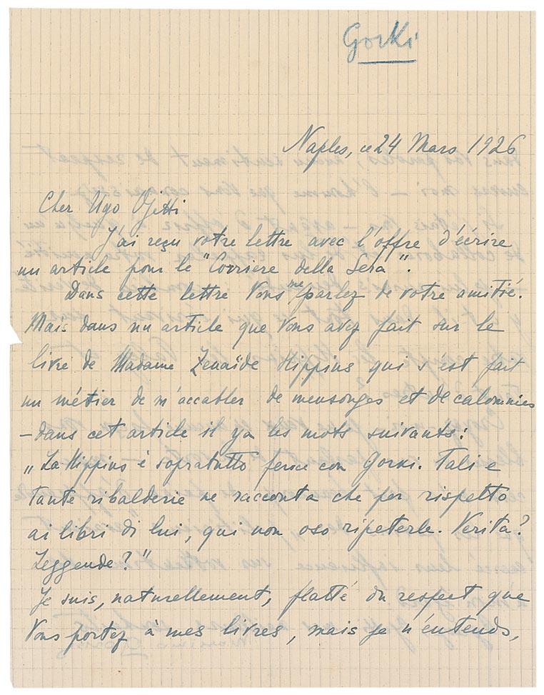 Important Russian/Soviet author and activist (1868–1936). Though his criticism of the Communist government led to a relationship marked by conflict and unease, he was ultimately embraced (though closely monitored) by the Stalinist regime, and Stalin himself was a pallbearer at Gorky’s funeral. LS in French, signed “Massimo Gorki,” on both sides of a sheet of lightly-lined graph paper, 8.5 x 11, March 24, 1926. Letter to Italian journalist Ugo Ojetti. Translated, in full: “I have received your letter with offer to write an article for ‘Corriere della Sera’ [large daily paper in Milan]. In this letter you are talking about your friendship. But in an article that you did on Mrs. Zenaïde Hippius’ book who has made it a business to heap lies and calumnies on me–in that article there are the following words [quoted in the original Italian]: ‘Mrs. Hippius is mostly fierce with Gorki. She describes so many bad tales about him that, for respect to his books, I don’t dare repeat here. Truth? Legends?’ I am of course flattered, flattered about the respect that you have for my books, but I do not hear in your words any feeling of respect towards me–the man that you know. If I were you–before offering collaboration to someone and before reminding that person of your friendship–I would have asked: how much truth is there in all that they write about you the Hippius, the Paley and so many more? Believe me it is not my intention to offend you in speaking that way –but it hurts me a lot to learn that the ‘politicians’ gossip had rooted their influence on your feeling towards me.” In fine condition, with intersecting mailing folds, pencil notation to top of page, a mild shade of toning, and a small chip to left edge. Ojetti, was a prominent Italian art critic and journalist who included an affectionate chapter about Gorki in his 1928 book, As They Seemed to Me. Despite the admiration, Gorki certainly seems to take offense to certain comments made by his friend!